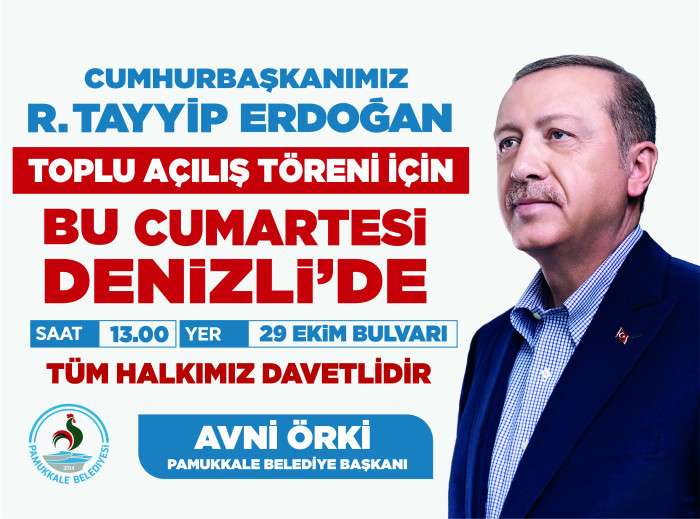 Cumhurbaşkanı Recep Tayyip Erdoğan, toplu açılış töreni için 28 Ocak 2023 Cumartesi günü saat 13.00’de Denizli’de olacak. 29 Ekim Bulvarı’nda gerçekleşecek olan toplu açılış töreni ile ilgili olarak Pamukkale Belediye Başkanı Avni Örki vatandaşlara davette bulundu. “Hasret bitti, artık kavuşma zamanı” diyen Başkan Örki, “Cumhurbaşkanımız Sayın Recep Tayyip Erdoğan şehrimize teşrif edecek. Cumhurbaşkanımız şehrimize birçok müjdeleriyle birlikte gelecek. Bu müjdelerin yanında şimdiye kadar yapılmış olan birçok eserin açılışını da gerçekleştirecek. Bu güzel coşkuya, bu güzel bayrama bütün hemşehrilerimizi, bütün Pamukkalelilerimizi yürekten davet ediyorum. Programımız elbette sizlerin katkısıyla, sizlerin katılımıyla çok daha güzel bir hale gelecek. Bu cumartesi günü 29 Ekim Bulvarında gerçekleştirecek olduğumuz büyük coşkuya büyük buluşmaya bütün vatandaşlarımızı bekliyorum” dedi.