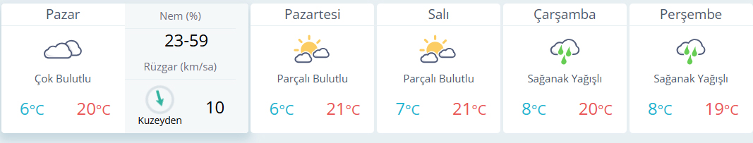 Denizli'de Pazar günü hava sıcaklığı 6 ila 20 derece arası değişirken hava parçalı ve çok bulutlu rüzgar kuzeyden 10 km/sa hızında eseceği tahmin ediliyor. Denizli'de 18 Mart Çarşamba gününden itibaren sağanak yağışın etkili olması beklenirken, yağışların arefe günü ve bayramda da etkili olması bekleniyor. Yağışlarla birlikte hava sıcaklıkları 3-4 derece düşeceği tahmin ediliyor.