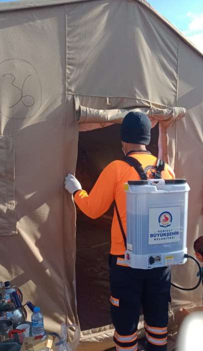 Depremin yaralarını sarmak için yüzlerce iş makinesi, araç ve personeliyle deprem bölgesinde çalışmalarına devam eden Denizli Büyükşehir Belediyesi, salgın hastalıklara karşı da dezenfeksiyon seferberliği başlattı. Çadır kentler ve ortak yaşam alanları başta olmak üzere deprem sonrası denizin yükselmesiyle birlikte mil kaplanan yollarda da temizlik ve hijyen çalışması yapılıyor.
