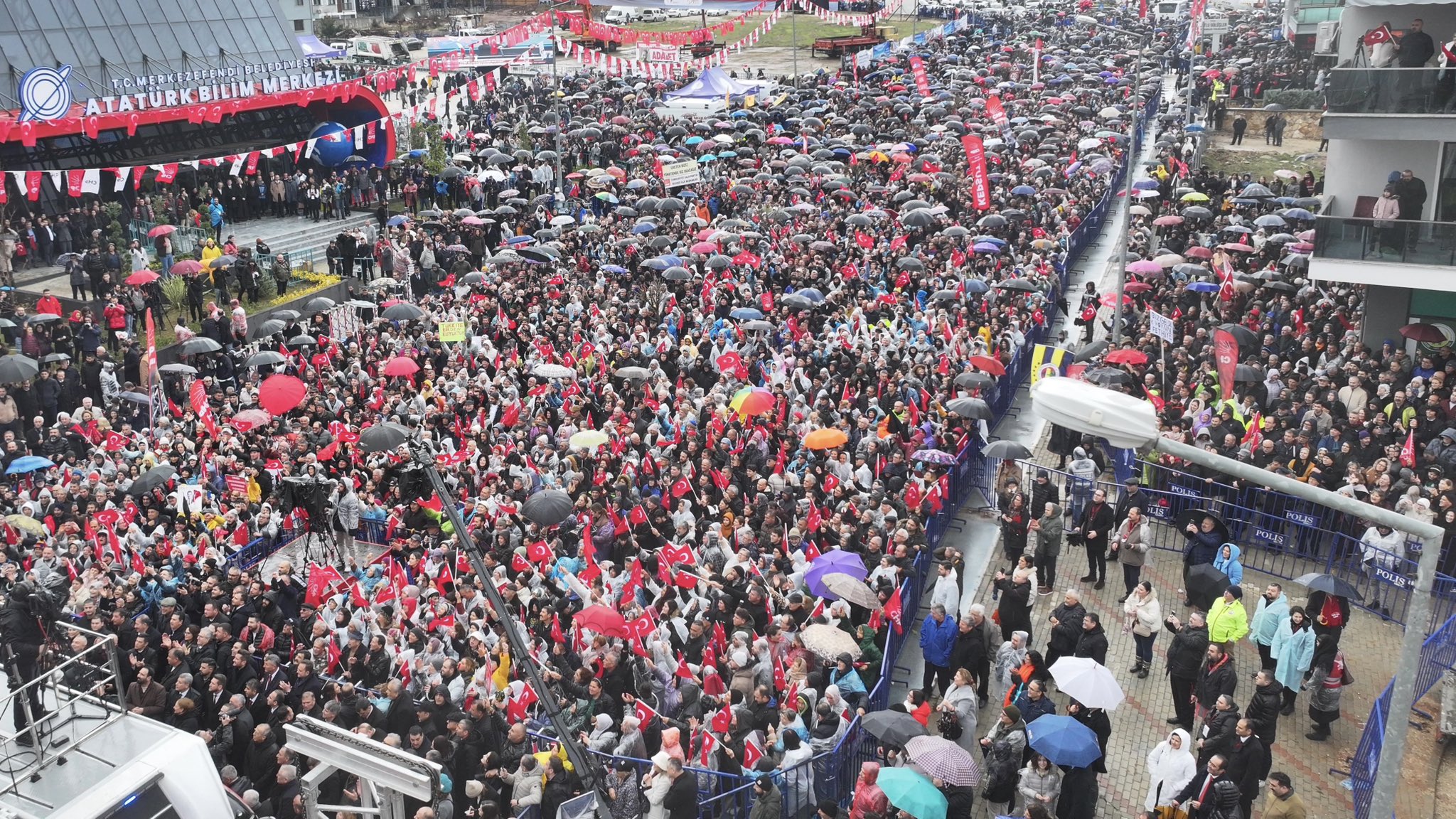 CHP Genel Başkanı Özgür Özel Merkezefendi Belediyesi Atatürk Bilim Merkezi açılışı için Denizli’ye geldi. Açılış öncesi düzenlenen mitinge yağmura rağmen kalabalık vatandaş topluluğu katıldı.