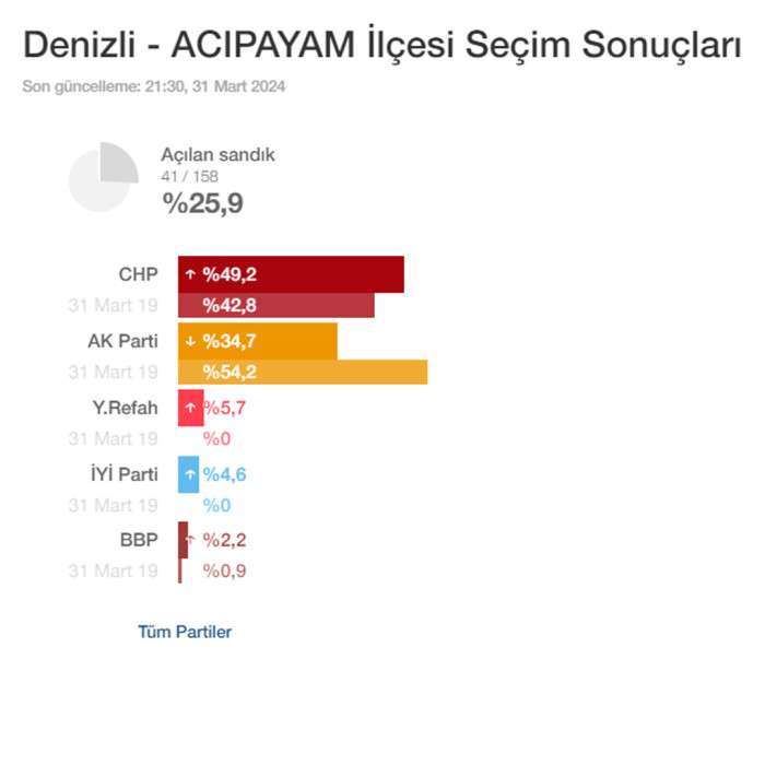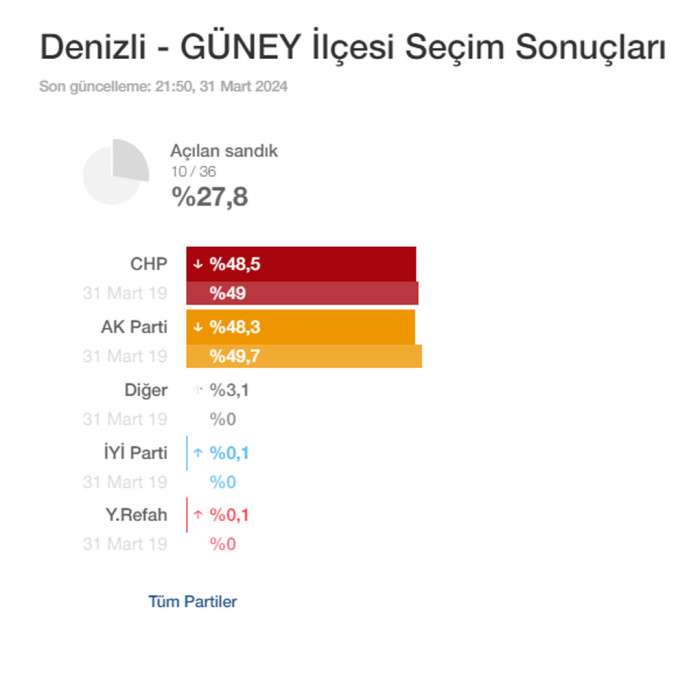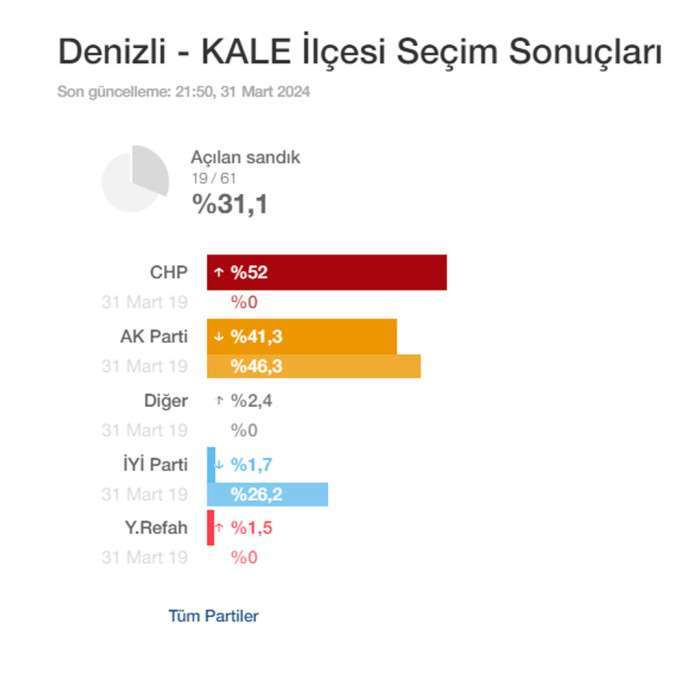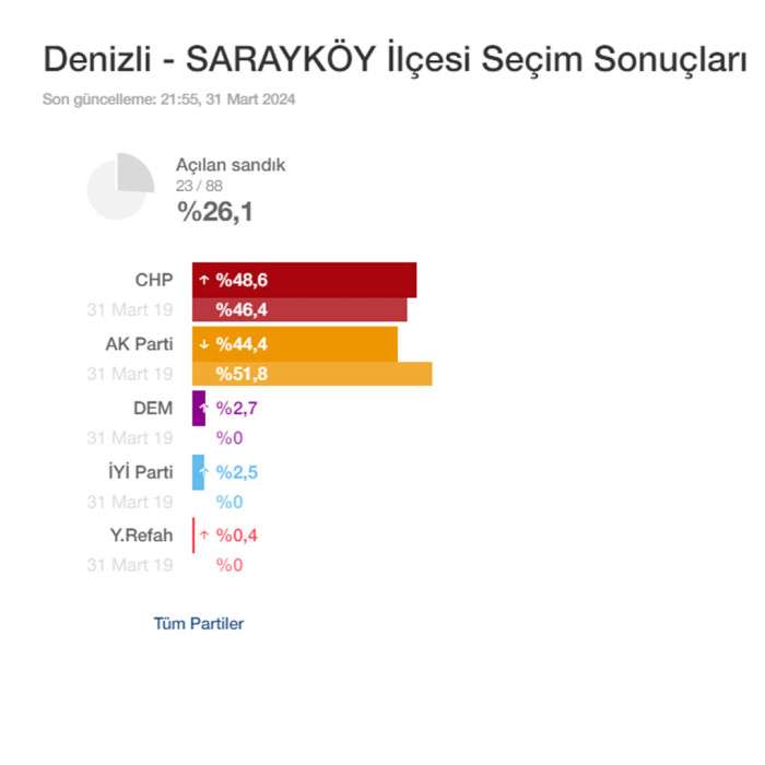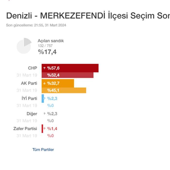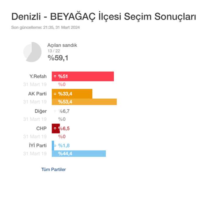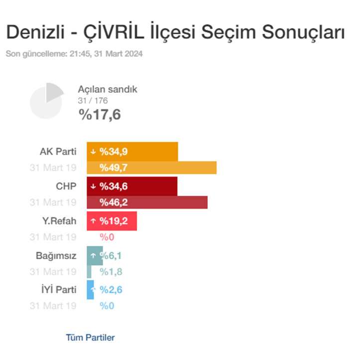 Denizli’de gelen verilere göre 2633 sandıktan 982’si açıldı. Bu verilere göre CHP 14 ilçede önde olurken, AK Parti 4 ilçede ve Yeniden Refah Partisi 1 ilçede önde gidiyor.