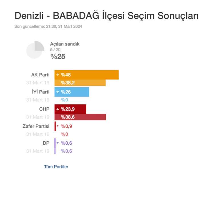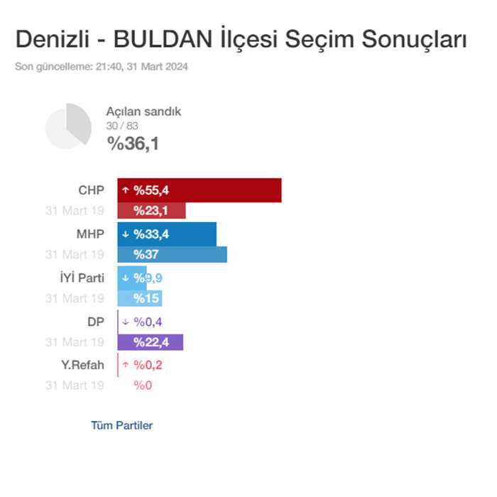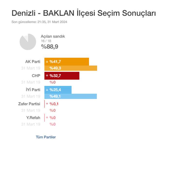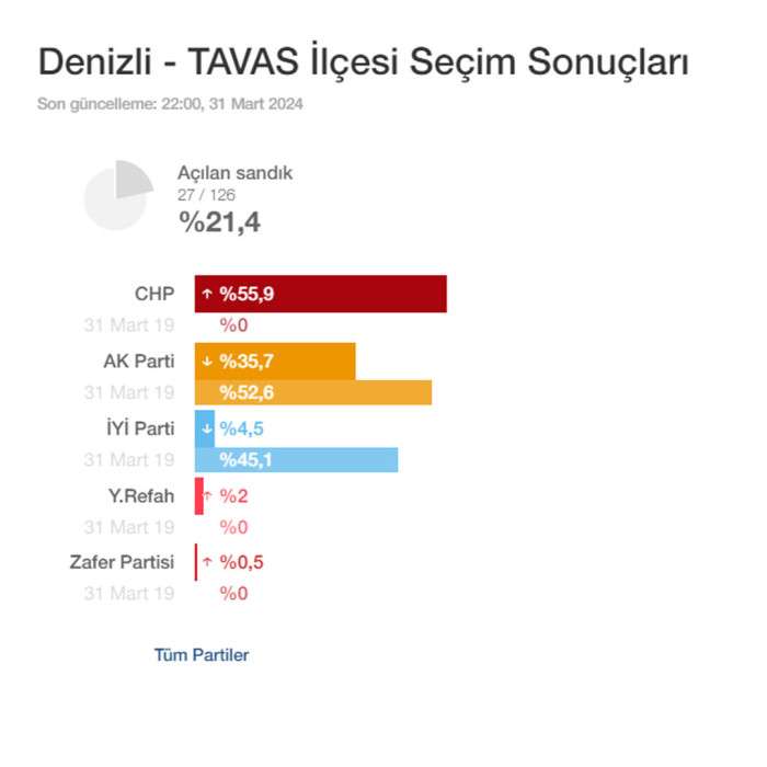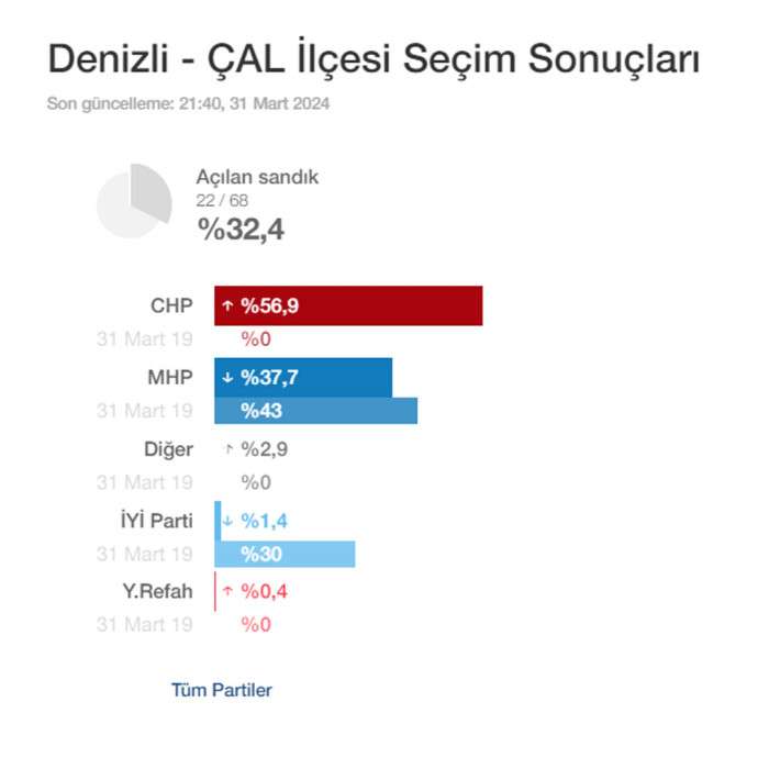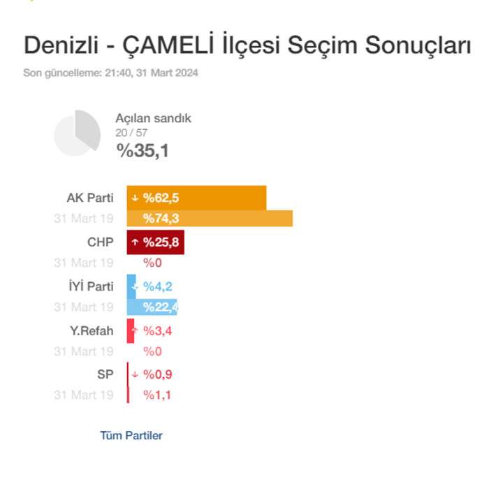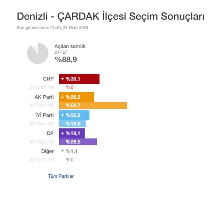Denizli’de gelen verilere göre 2633 sandıktan 982’si açıldı. Bu verilere göre CHP 14 ilçede önde olurken, AK Parti 4 ilçede ve Yeniden Refah Partisi 1 ilçede önde gidiyor.