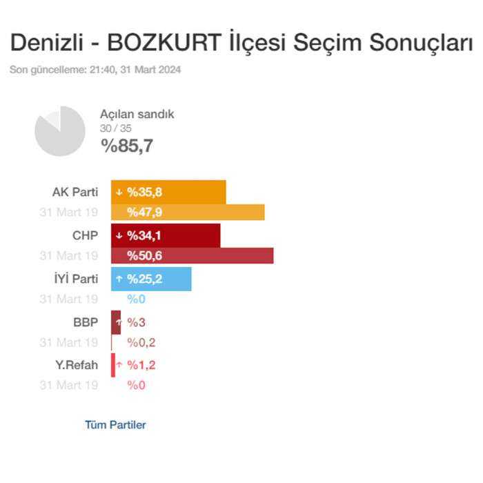 AK Parti, 2019 seçimlerinde sahip olduğu 13 ilçenin 11’ini son verilere göre kaybettiği görülürken CHP’nin sahip olduğu Babadağ ve Bozkurt ilçelerinde önde gözüküyor. CHP Büyükşehirde de Bülent Nuri Çavuşoğlu ile sırtlamış gözüküyor.