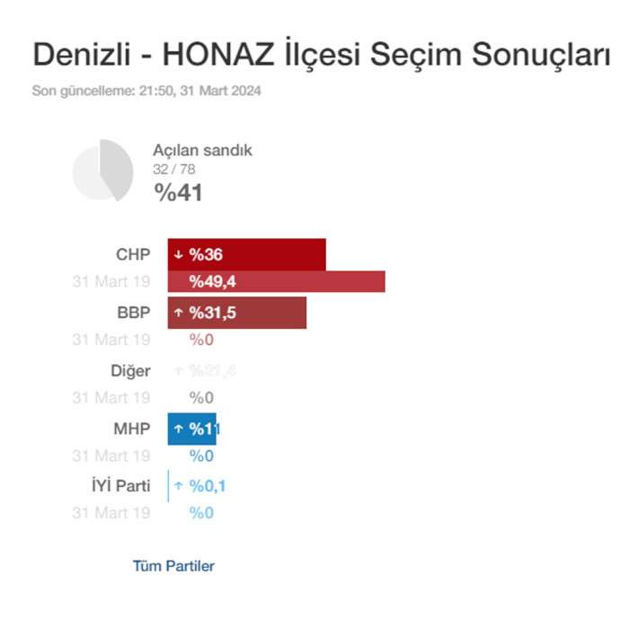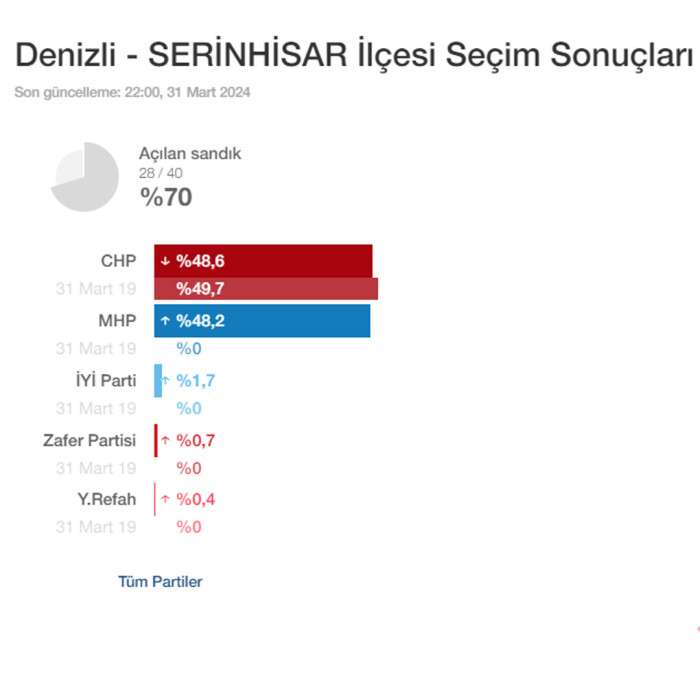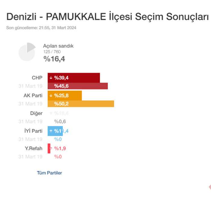 Denizli’de 19 ilçede, önde giden CHP 14 ilçede seçimi göğüslerken Ak Parti 4 ve Yeniden Refah Partisi 1 ilçede önde gözüküyor.