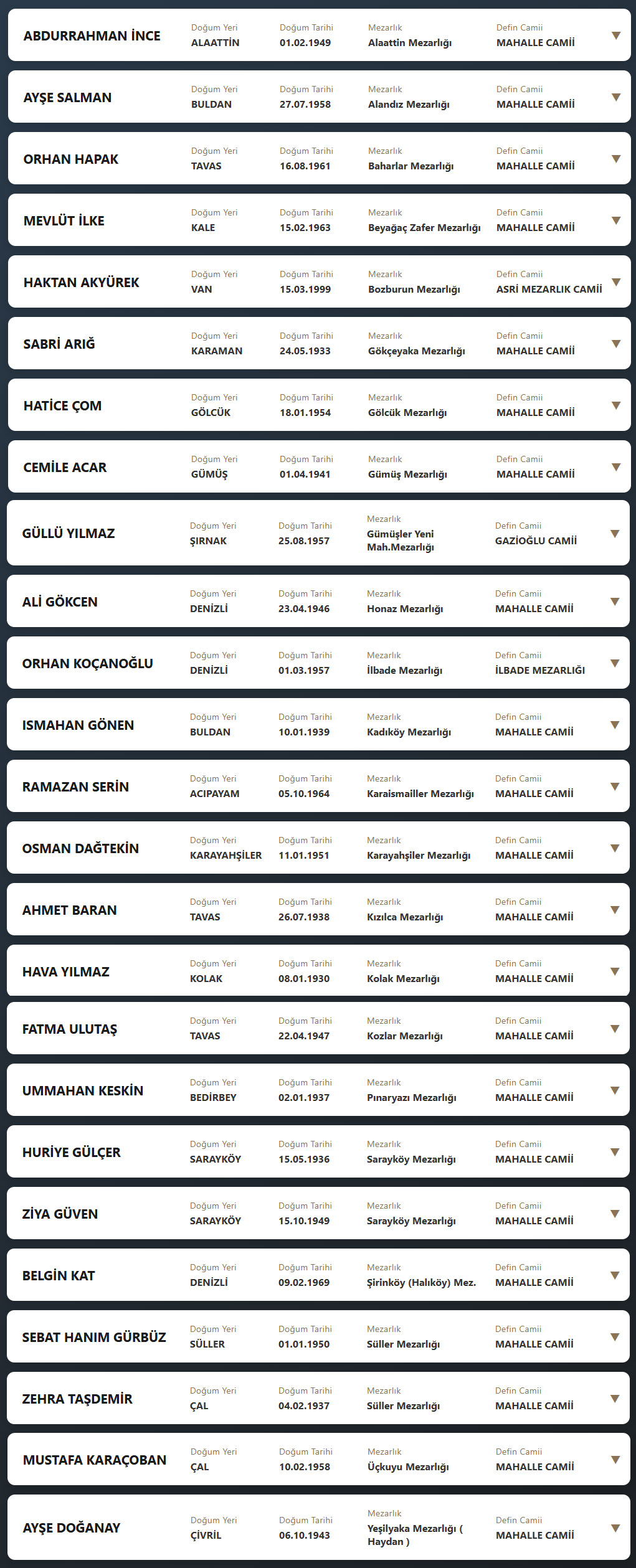 Denizli il sınırları içerisinde vefat edenlerin, cenaze namazlarının kılınacağı cami ve kaldırılacağı mezarlık bilgileri... 02 Nisan 2026 Perşembe günü Denizli'de vefat edenler.