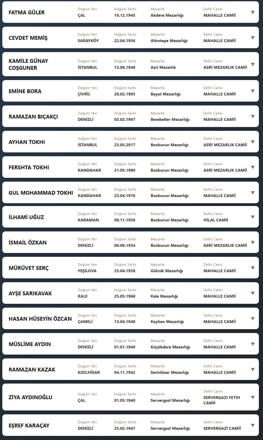 Denizli il sınırları içerisinde vefat edenlerin, cenaze namazlarının kılınacağı cami ve kaldırılacağı mezarlık bilgileri... 05 Nisan 2026 Pazar günü Denizli'de vefat edenler.