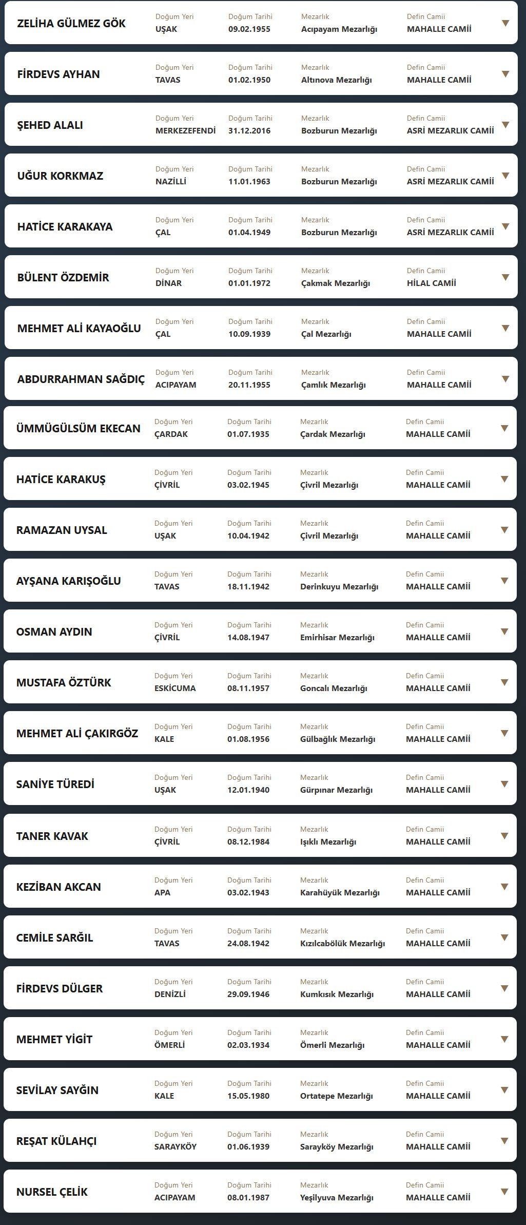 Denizli il sınırları içerisinde vefat edenlerin, cenaze namazlarının kılınacağı cami ve kaldırılacağı mezarlık bilgileri... 07 Nisan 2026 Salı günü Denizli'de vefat edenler.