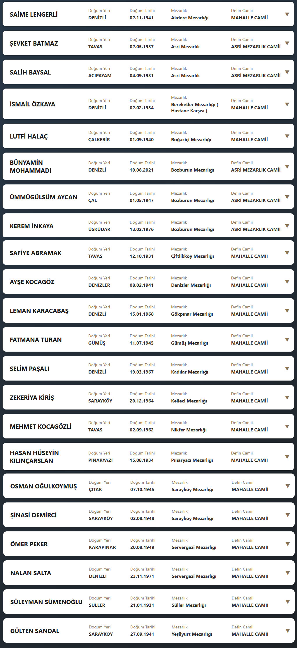 Denizli il sınırları içerisinde vefat edenlerin, cenaze namazlarının kılınacağı cami ve kaldırılacağı mezarlık bilgileri... 09 Nisan 2026 Perşembe günü Denizli'de vefat edenler.