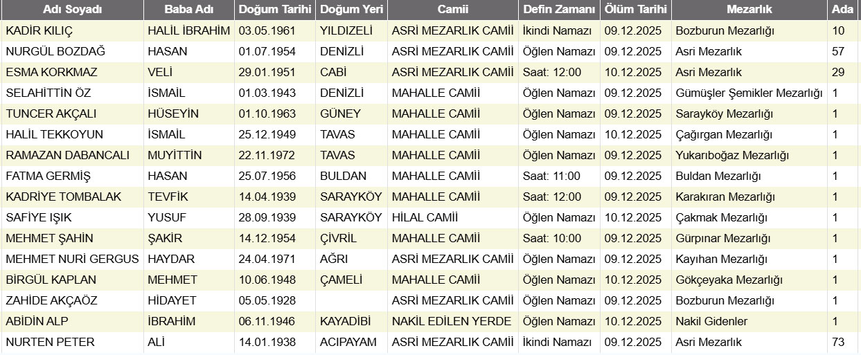 Denizli'de bugün vefat edenler 10 Aralık 2025