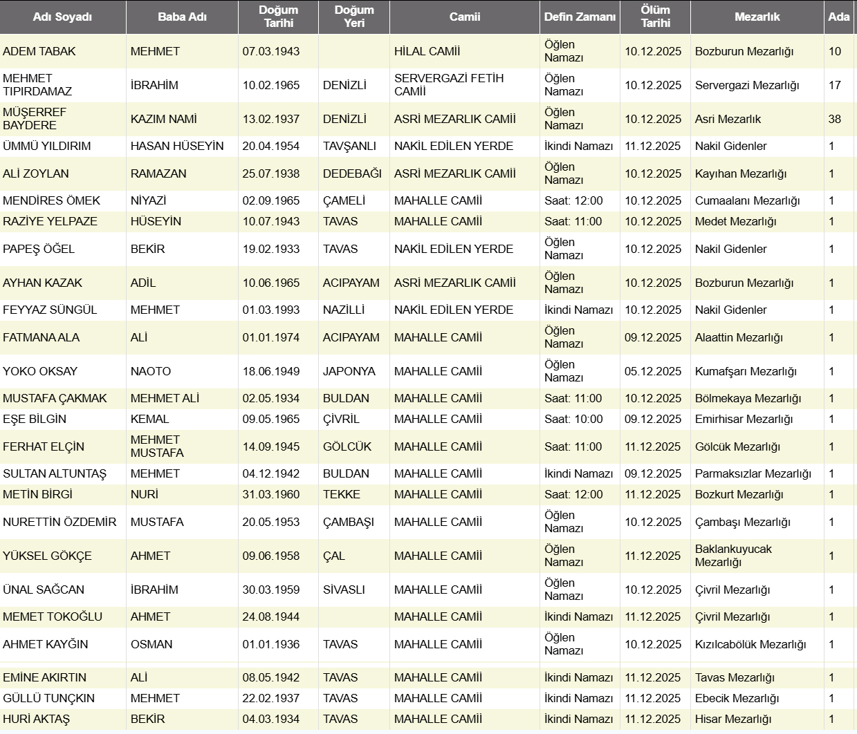 Denizli'de bugün vefat edenler 11 Aralık 2025