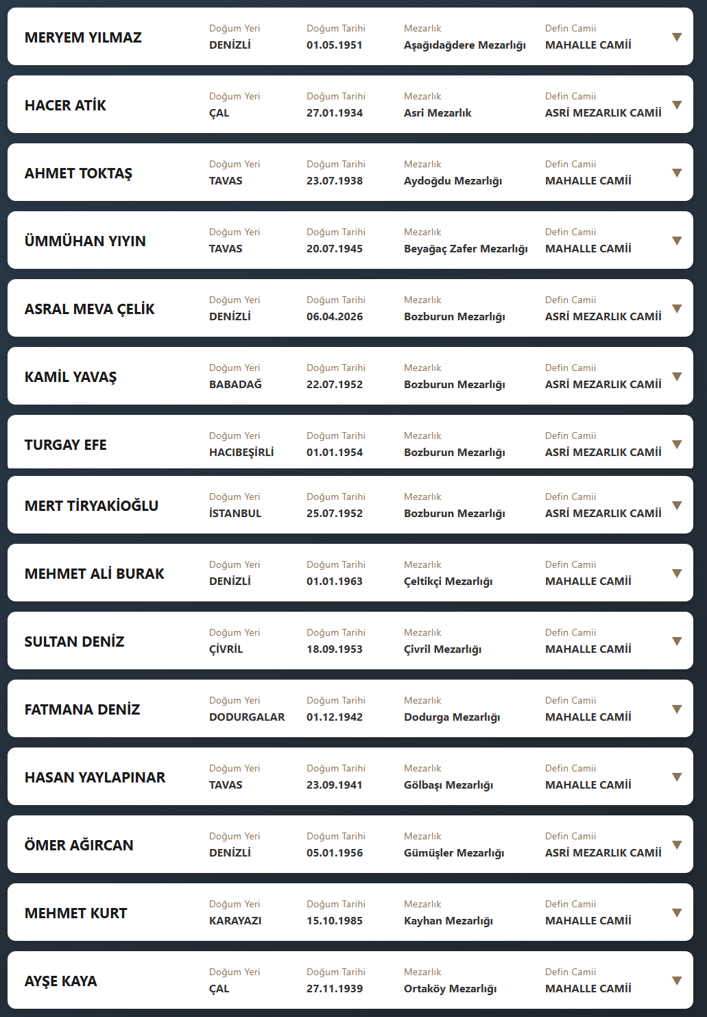 Denizli il sınırları içerisinde vefat edenlerin, cenaze namazlarının kılınacağı cami ve kaldırılacağı mezarlık bilgileri... 13 Nisan 2026 Pazartesi günü Denizli'de vefat edenler.
