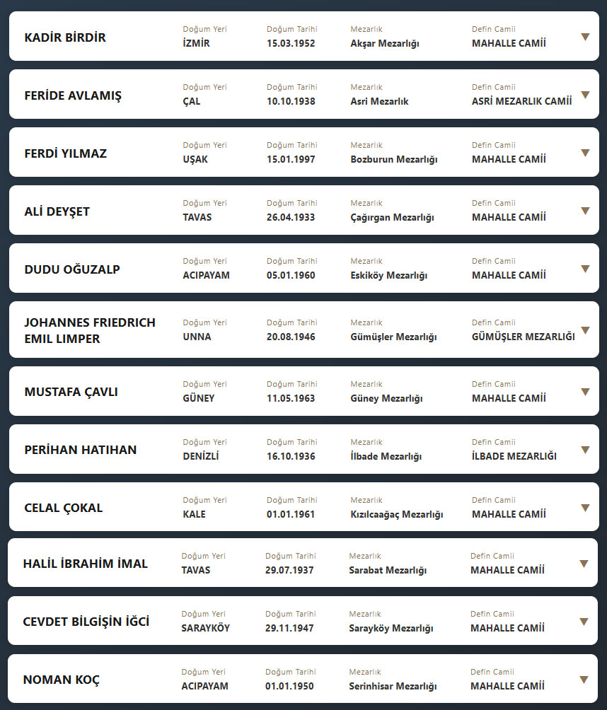 Denizli il sınırları içerisinde vefat edenlerin, cenaze namazlarının kılınacağı cami ve kaldırılacağı mezarlık bilgileri... 13 Şubat 2026 günü Cuma Denizli'de vefat edenler.