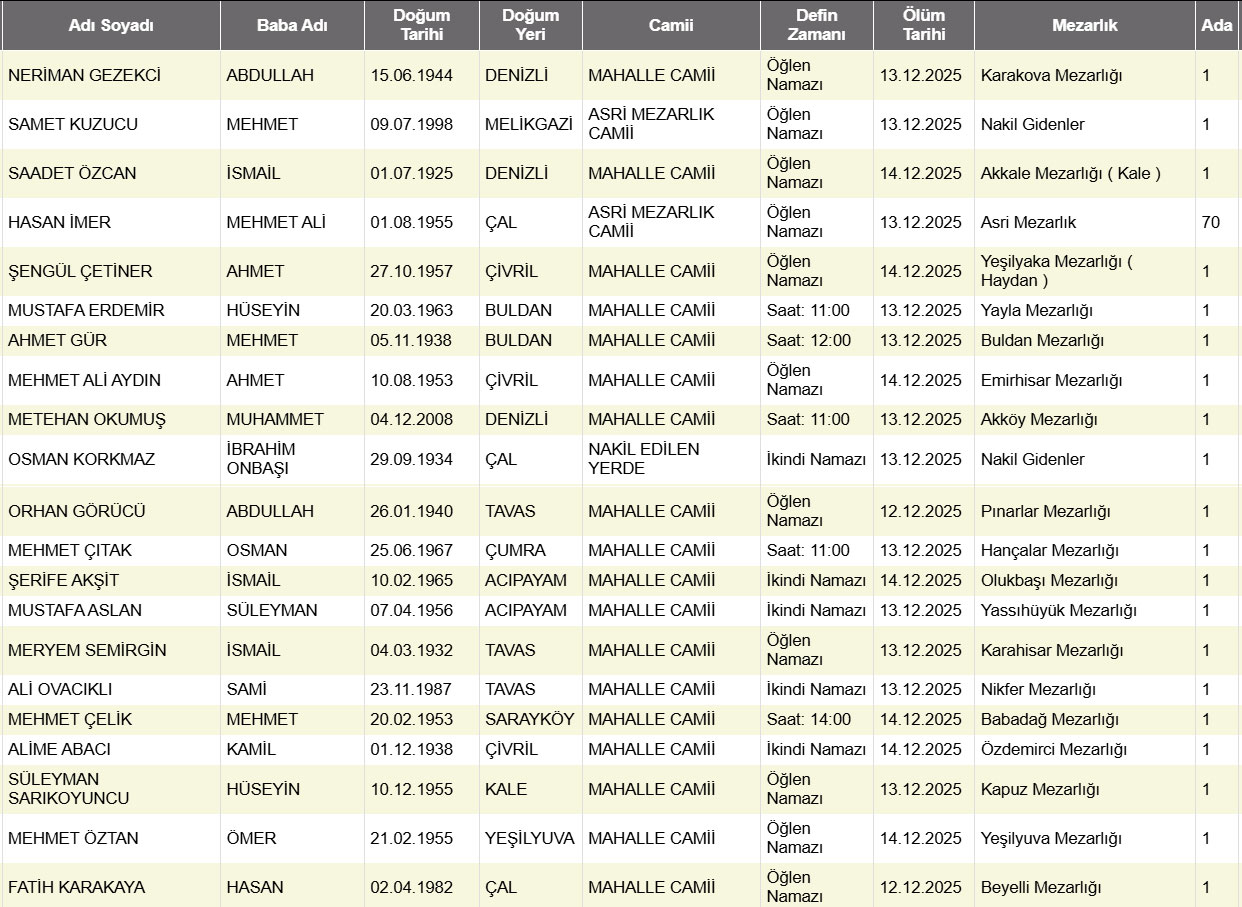 Denizli il sınırları içerisinde vefat edenlerin, cenaze namazlarının kılınacağı cami ve kaldırılacağı mezarlık bilgileri... 14 Aralık 2025 günü Pazar Denizli'de vefat edenler.