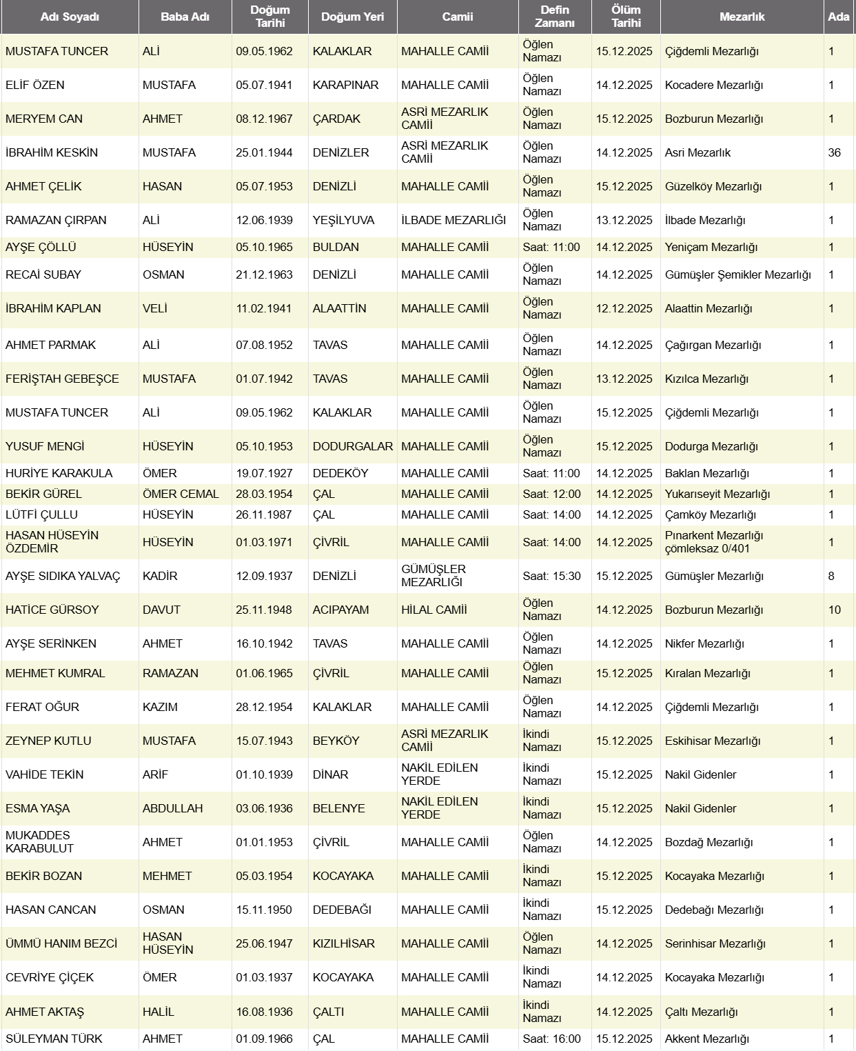 Denizli il sınırları içerisinde vefat edenlerin, cenaze namazlarının kılınacağı cami ve kaldırılacağı mezarlık bilgileri... 15 Aralık 2025 günü Pazartesi Denizli'de vefat edenler.