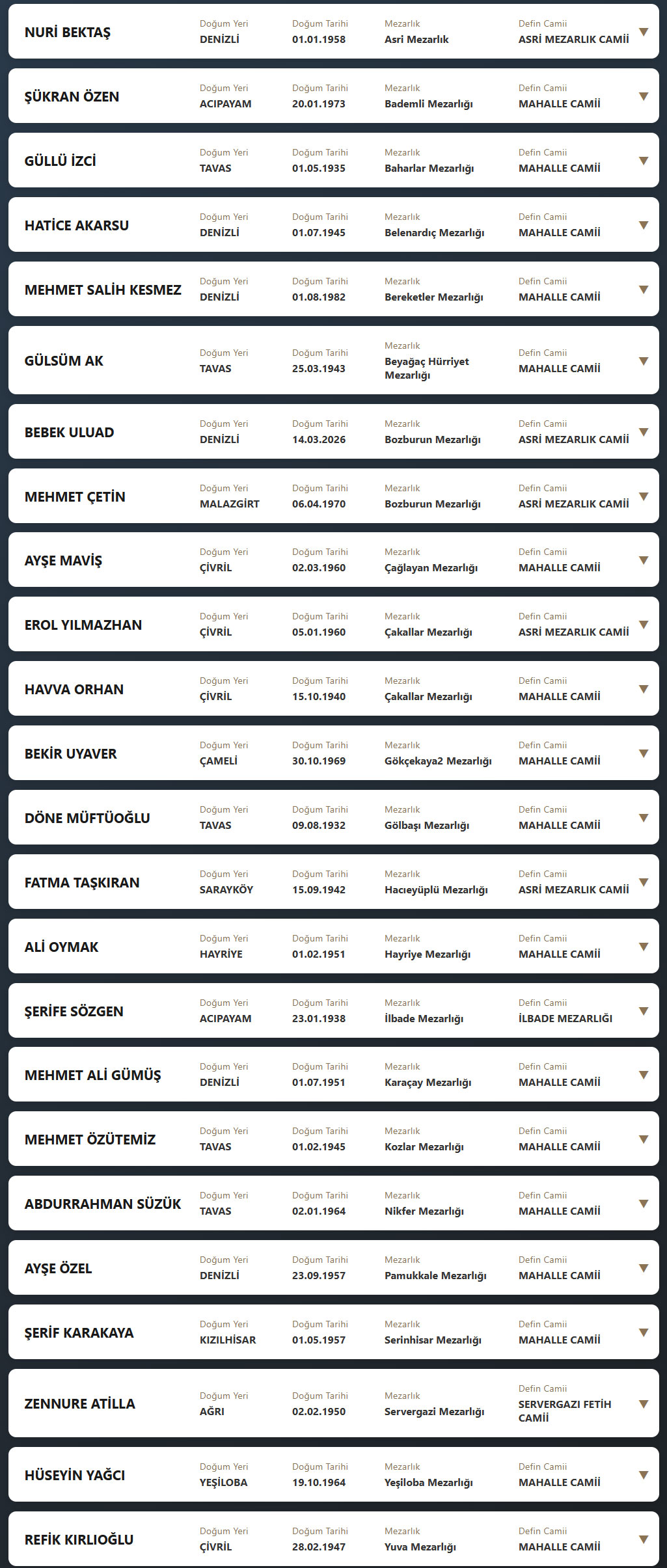 Denizli il sınırları içerisinde vefat edenlerin, cenaze namazlarının kılınacağı cami ve kaldırılacağı mezarlık bilgileri... 15 Mart 2026 Pazar günü Denizli'de vefat edenler.