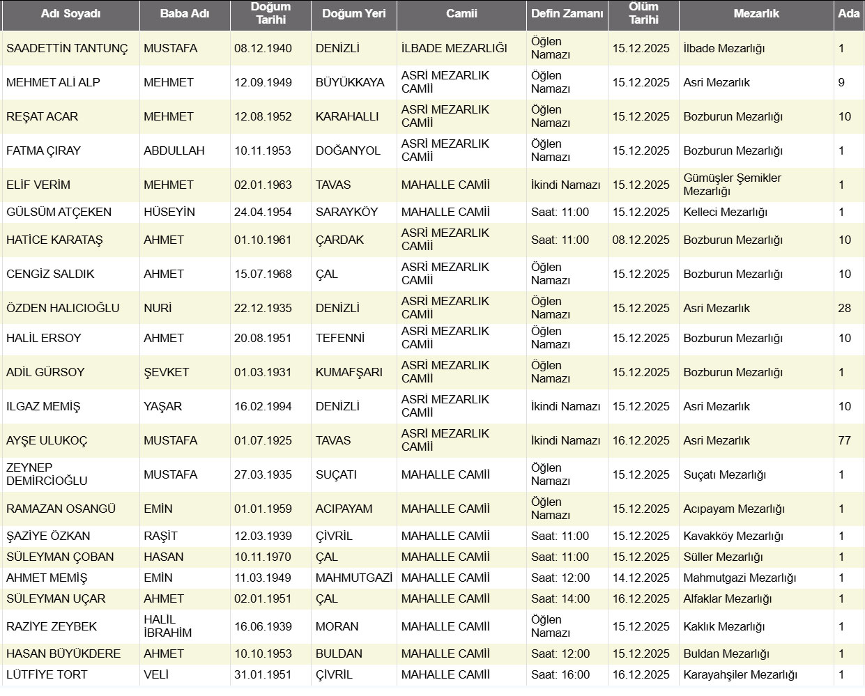 Denizli il sınırları içerisinde vefat edenlerin, cenaze namazlarının kılınacağı cami ve kaldırılacağı mezarlık bilgileri... 16 Aralık 2025 günü Salı Denizli'de vefat edenler.