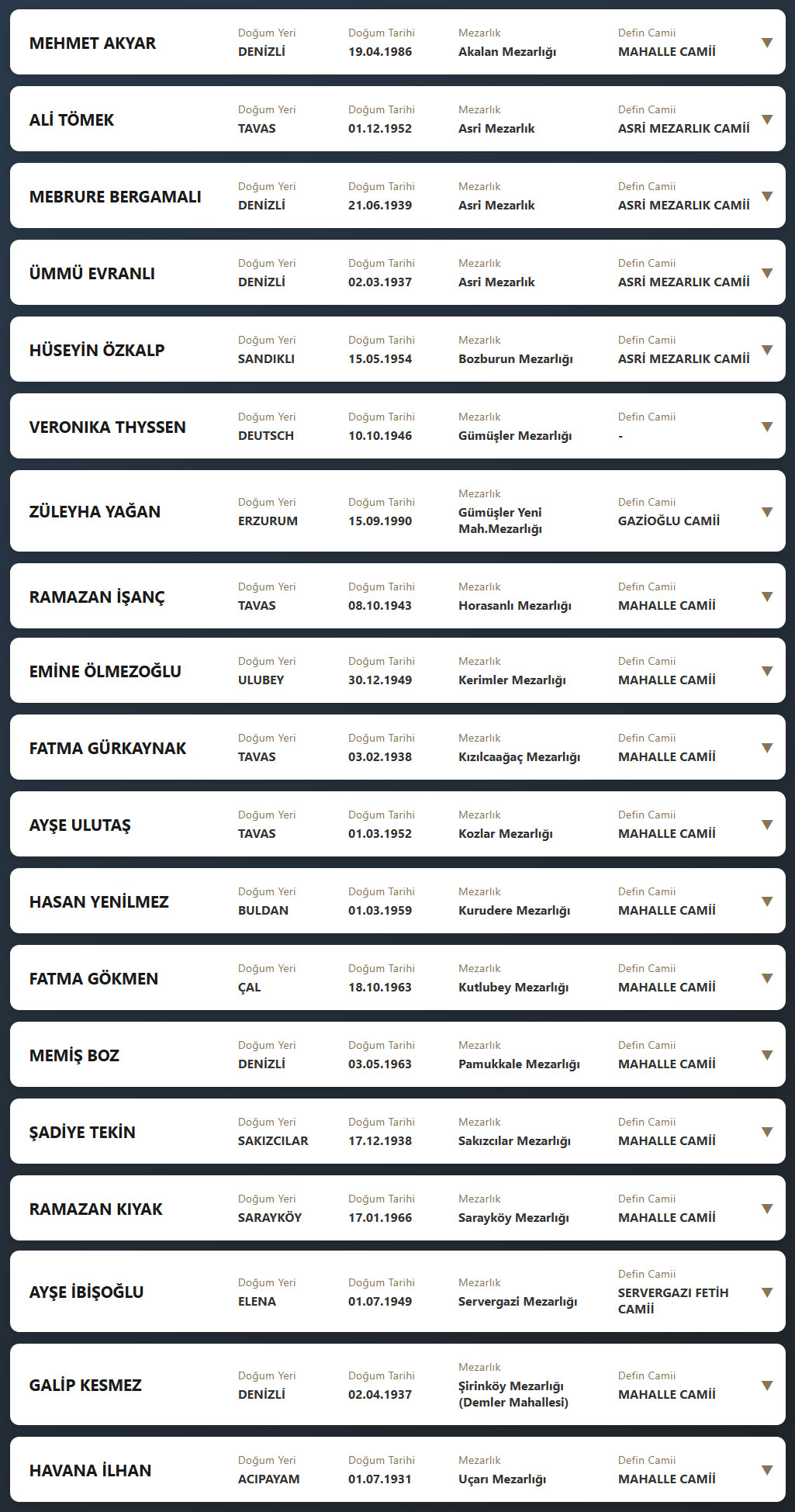 Denizli il sınırları içerisinde vefat edenlerin, cenaze namazlarının kılınacağı cami ve kaldırılacağı mezarlık bilgileri... 16 Nisan 2026 Perşembe günü Denizli'de vefat edenler.