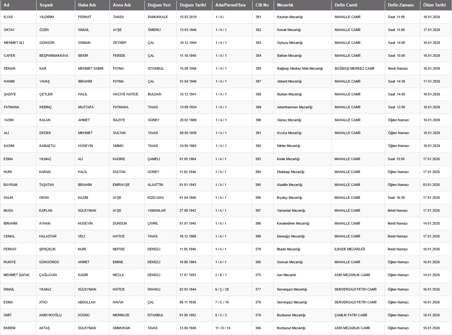 Denizli il sınırları içerisinde vefat edenlerin, cenaze namazlarının kılınacağı cami ve kaldırılacağı mezarlık bilgileri... 17 Ocak 2026 günü Cumartesi Denizli'de vefat edenler.