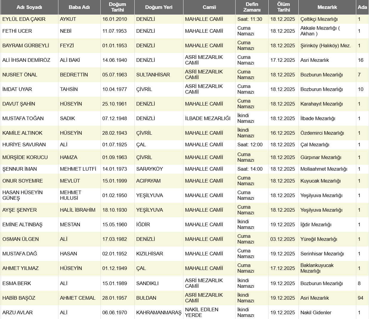 Denizli'de bugün vefat edenler 19 Aralık 2025