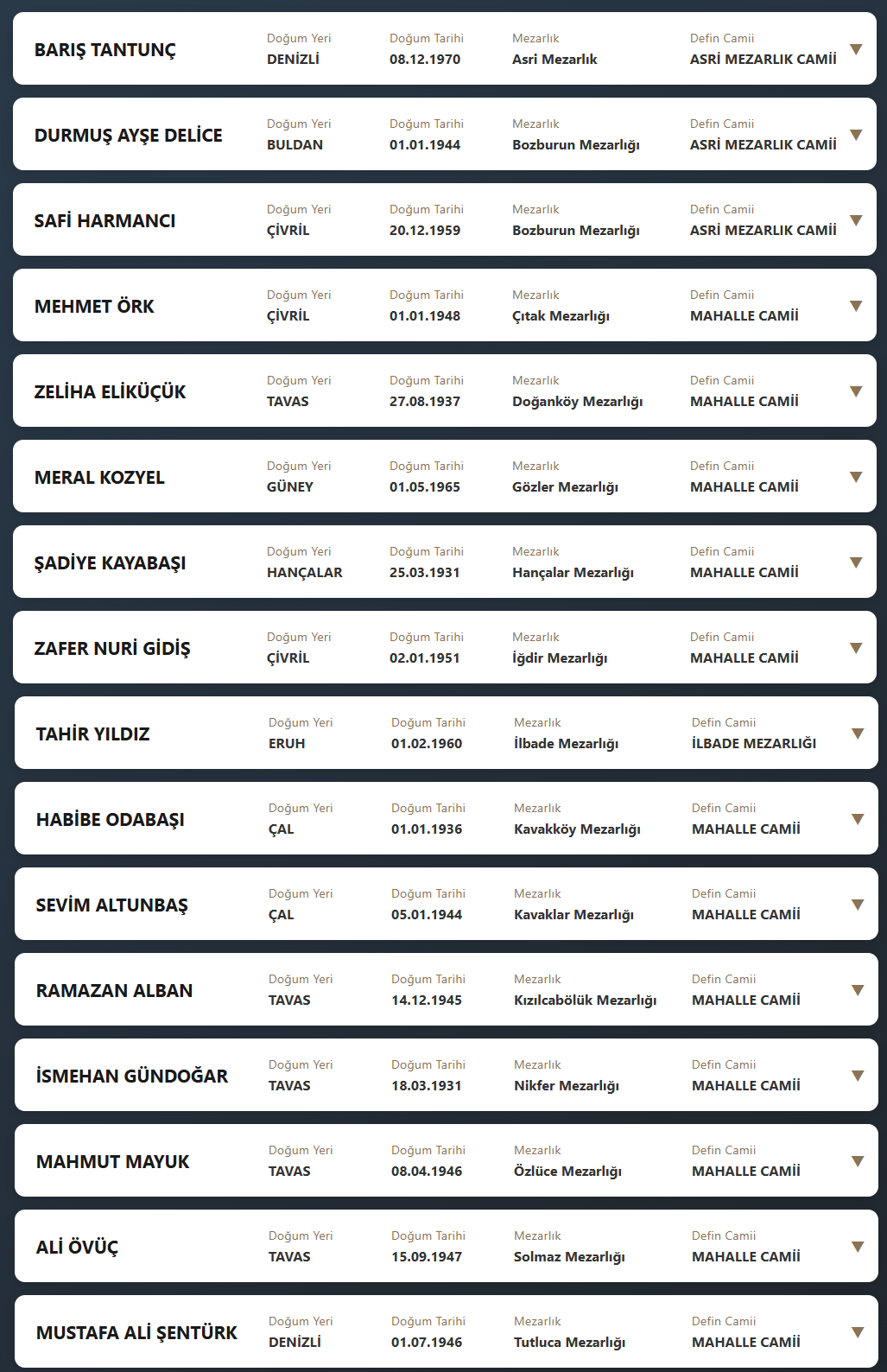 Denizli il sınırları içerisinde vefat edenlerin, cenaze namazlarının kılınacağı cami ve kaldırılacağı mezarlık bilgileri... 19 Mart 2026 Perşembe günü Denizli'de vefat edenler.