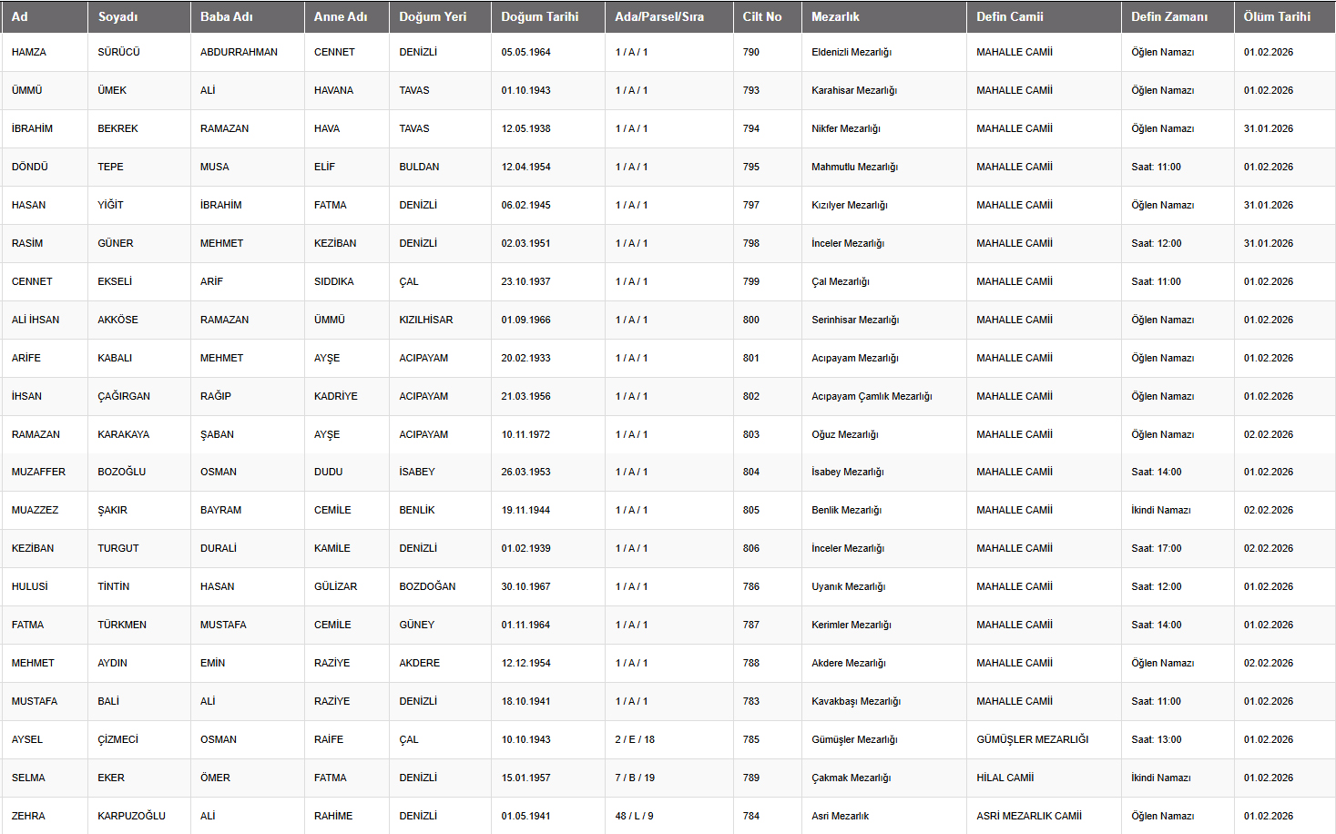 Denizli il sınırları içerisinde vefat edenlerin, cenaze namazlarının kılınacağı cami ve kaldırılacağı mezarlık bilgileri... 2 Şubat 2026 günü Pazartesi Denizli'de vefat edenler.