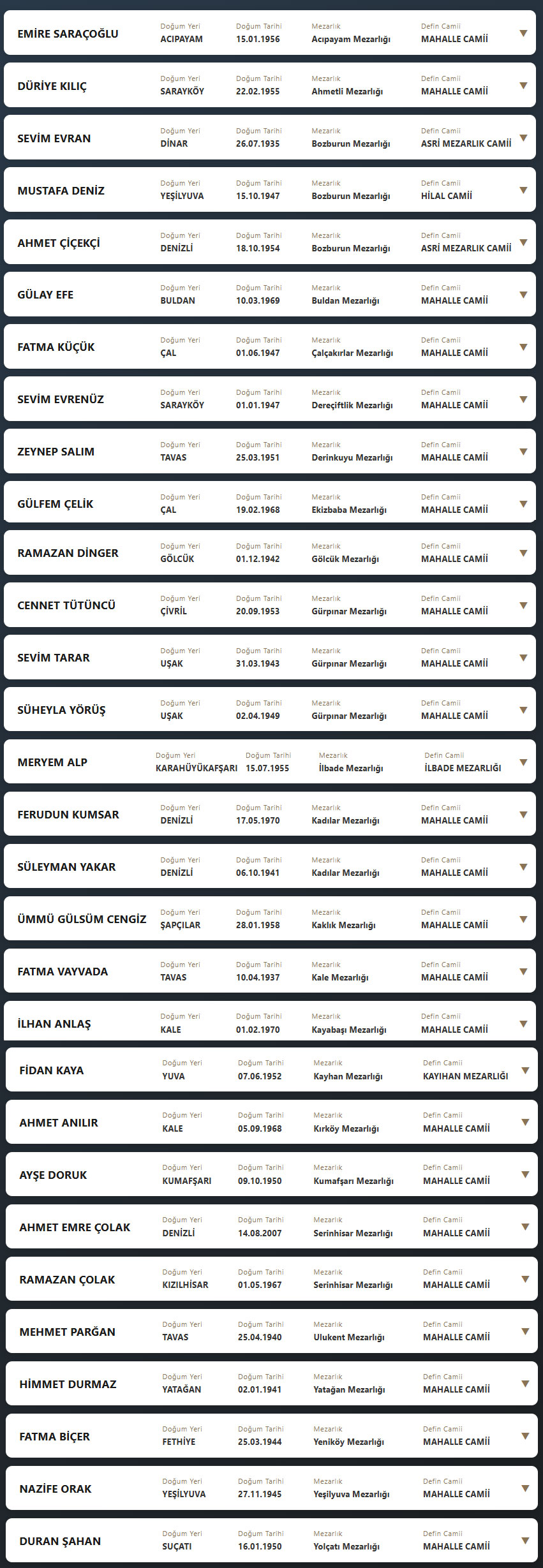 Denizli il sınırları içerisinde vefat edenlerin, cenaze namazlarının kılınacağı cami ve kaldırılacağı mezarlık bilgileri... 20 Şubat 2026 günü Cuma Denizli'de vefat edenle