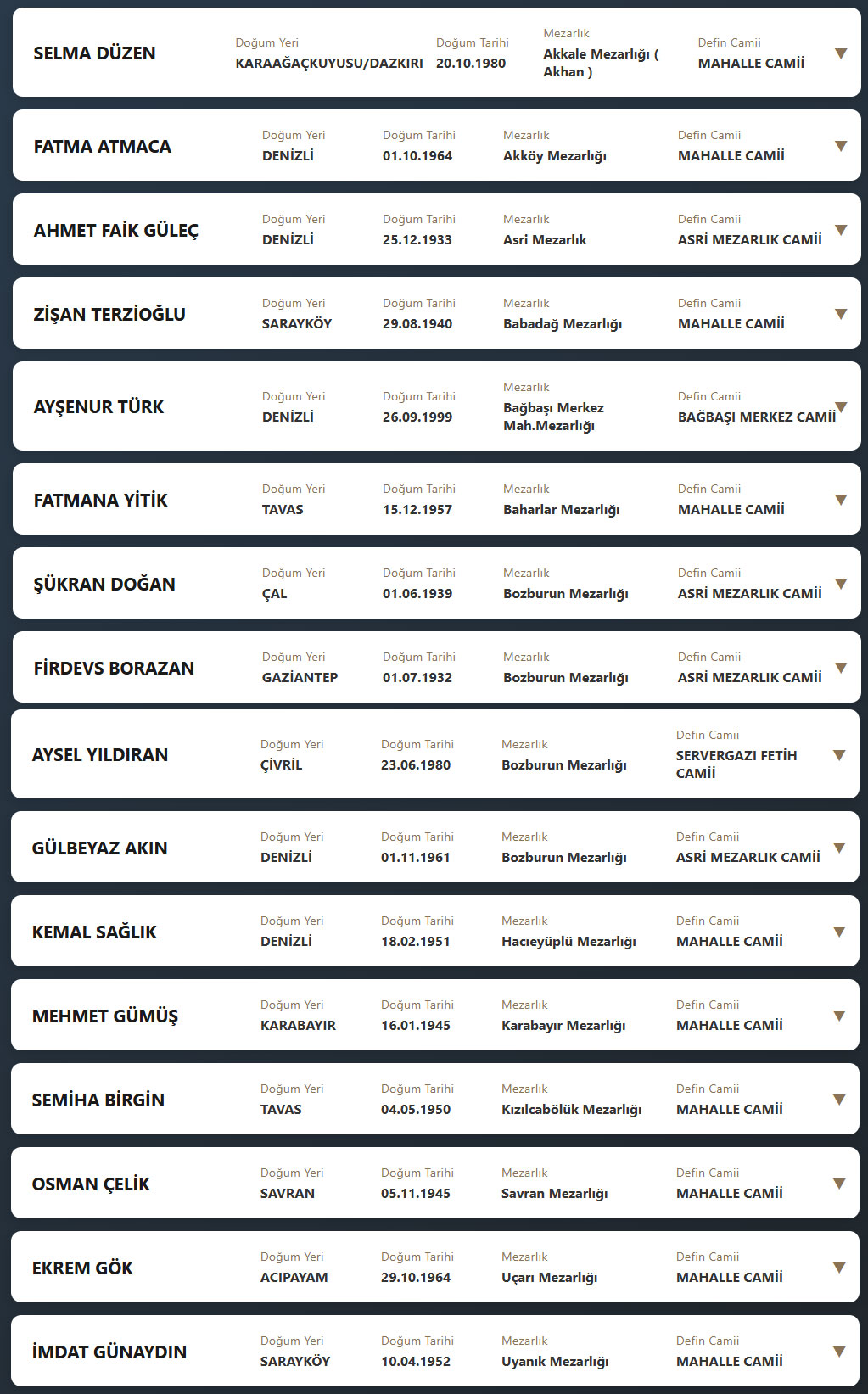 Denizli il sınırları içerisinde vefat edenlerin, cenaze namazlarının kılınacağı cami ve kaldırılacağı mezarlık bilgileri... 21 Nisan 2026 Salı günü Denizli'de vefat edenler.