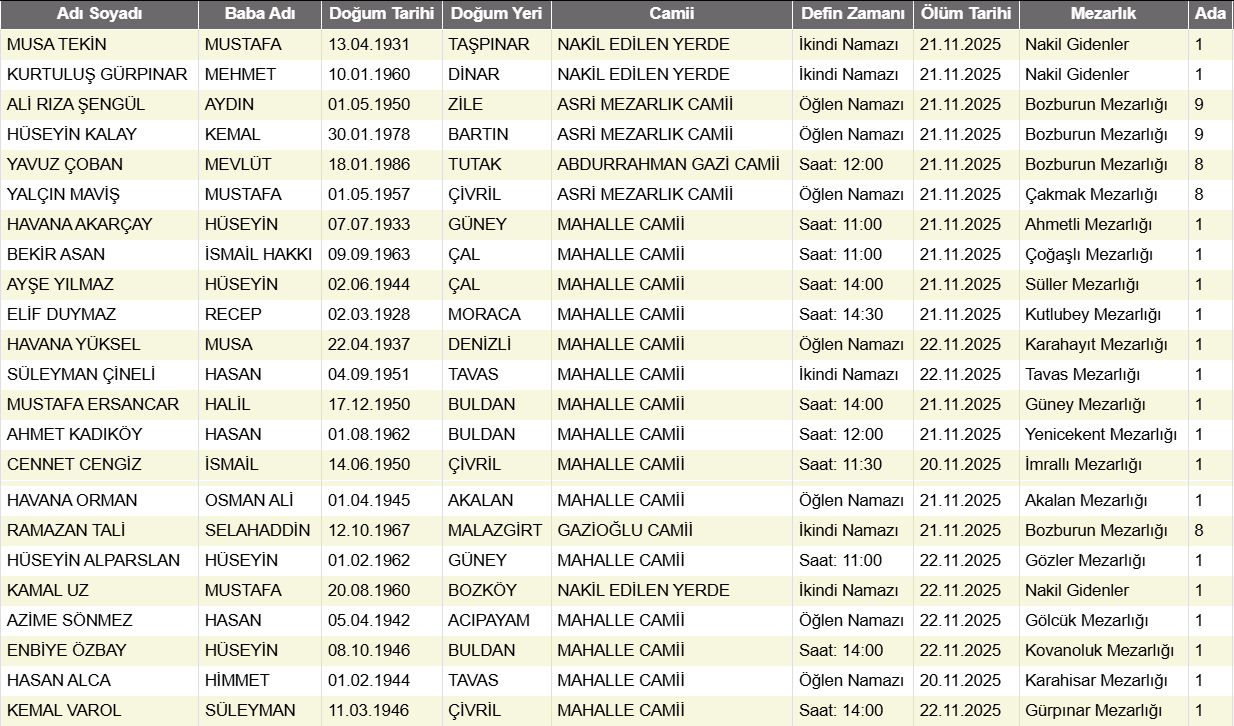 Denizli'de bugün vefat edenler 22 Kasım 2025