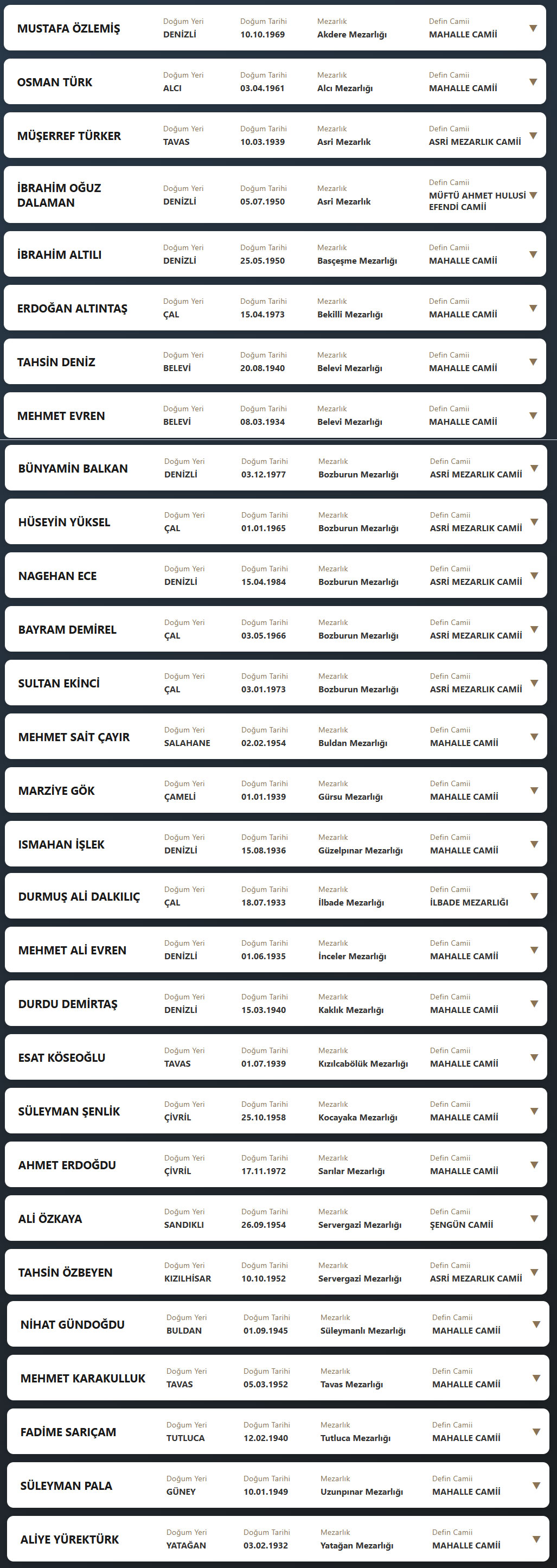 Denizli il sınırları içerisinde vefat edenlerin, cenaze namazlarının kılınacağı cami ve kaldırılacağı mezarlık bilgileri... 22 Nisan 2026 Çarşamba günü Denizli'de vefat edenler.