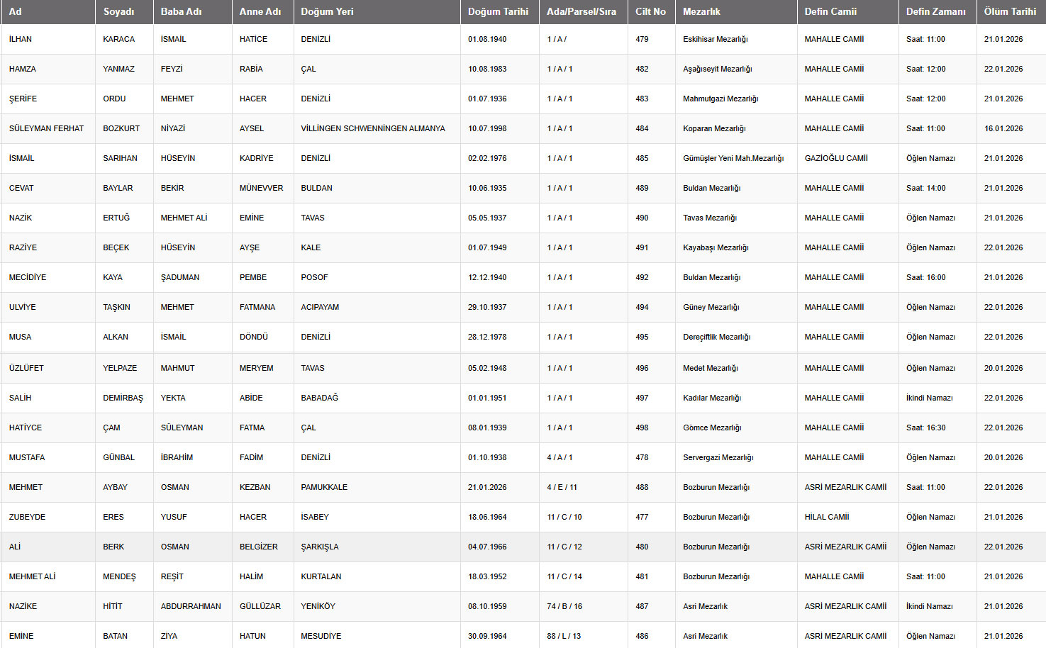 Denizli il sınırları içerisinde vefat edenlerin, cenaze namazlarının kılınacağı cami ve kaldırılacağı mezarlık bilgileri... 22 Ocak 2026 günü Perşembe Denizli'de vefat edenler.