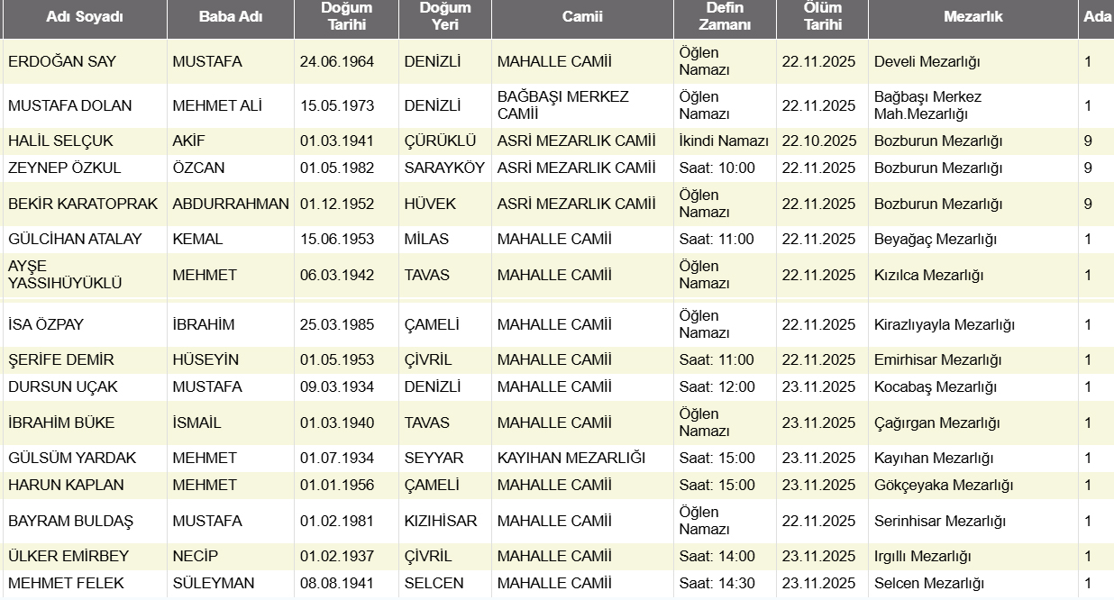 Denizli il sınırları içerisinde vefat edenlerin, cenaze namazlarının kılınacağı cami ve kaldırılacağı mezarlık bilgileri... 23 Kasım 2025 günü Pazar Denizli'de vefat edenler.