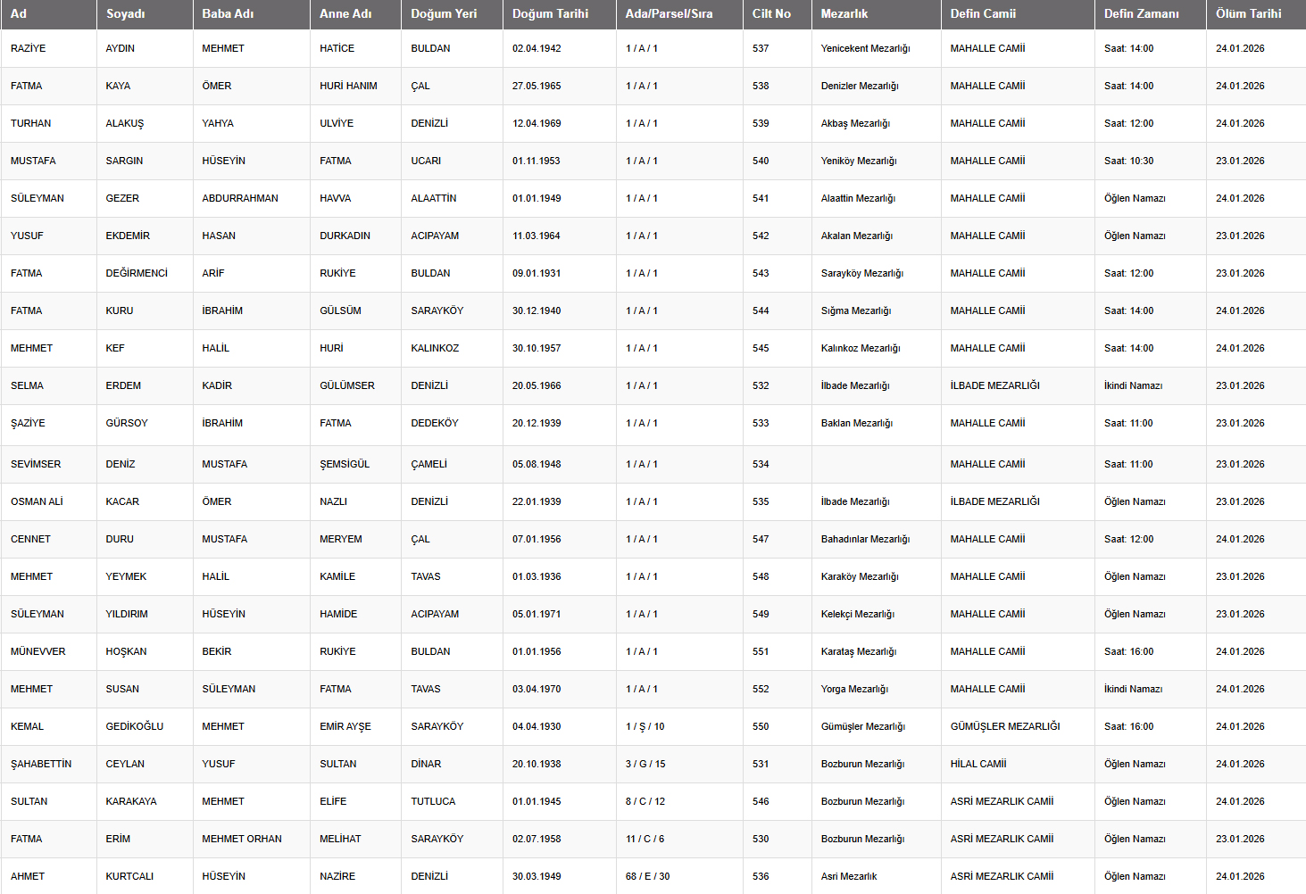 Denizli'de bugün vefat edenler 24 Ocak 2026