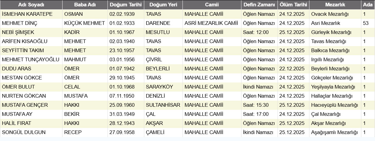 Denizli'de bugün vefat edenler 25 Aralık 2025