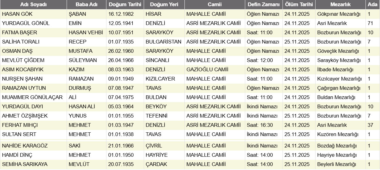Denizli'de bugün vefat edenler 25 Kasım 2025