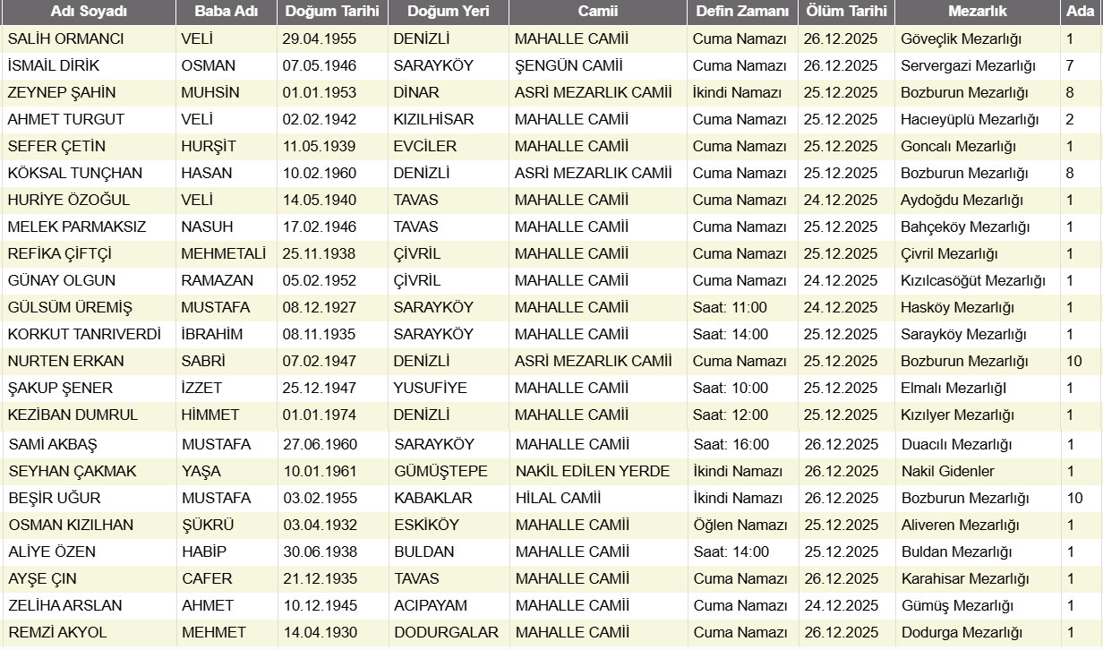 Denizli'de bugün vefat edenler 26 Aralık 2025