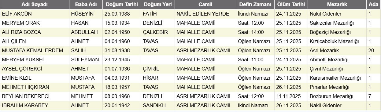 Denizli'de bugün vefat edenler 26 Kasım 2025