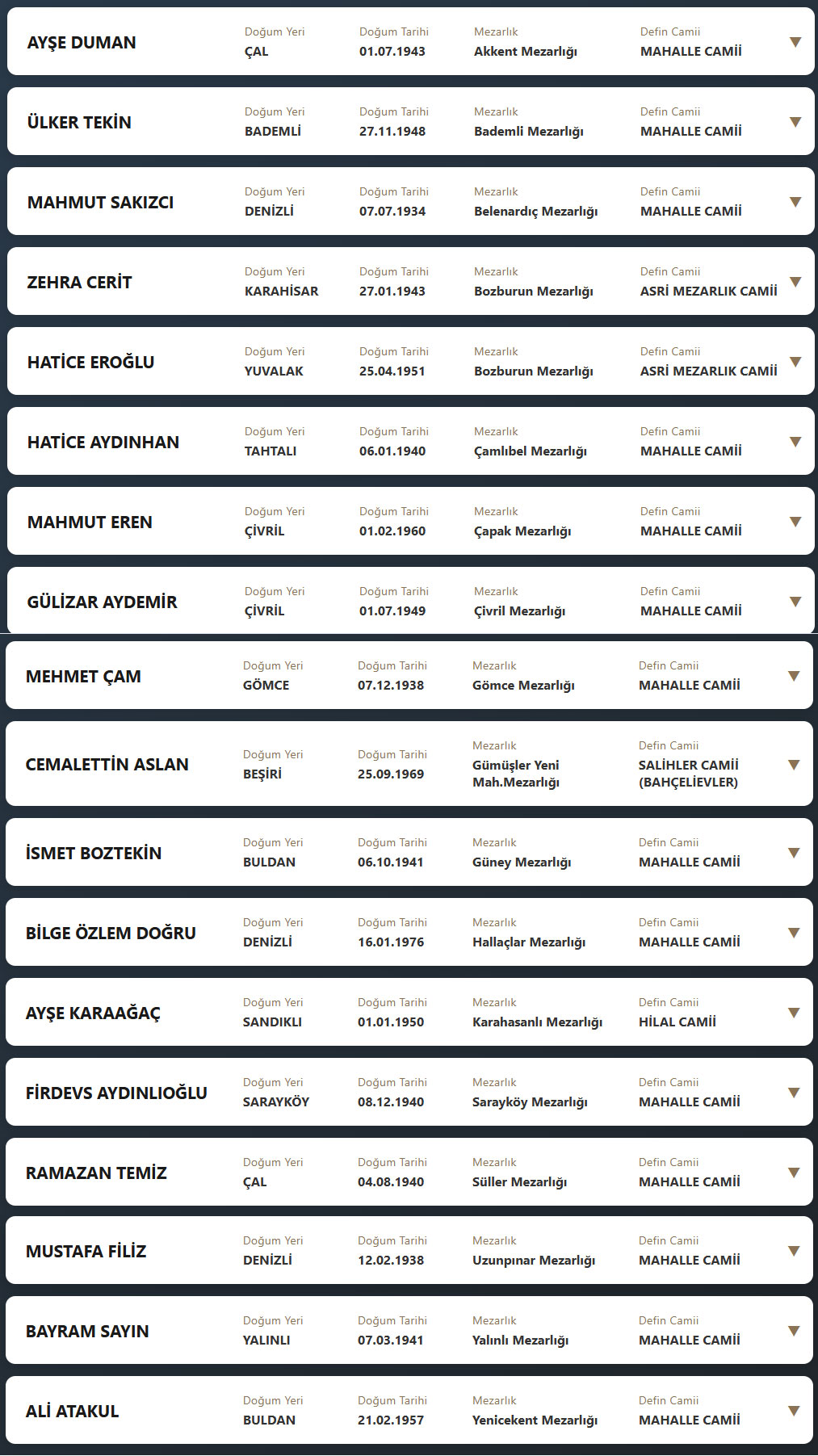 Denizli il sınırları içerisinde vefat edenlerin, cenaze namazlarının kılınacağı cami ve kaldırılacağı mezarlık bilgileri... 26 Nisan 2026 Pazar günü Denizli'de vefat edenler.