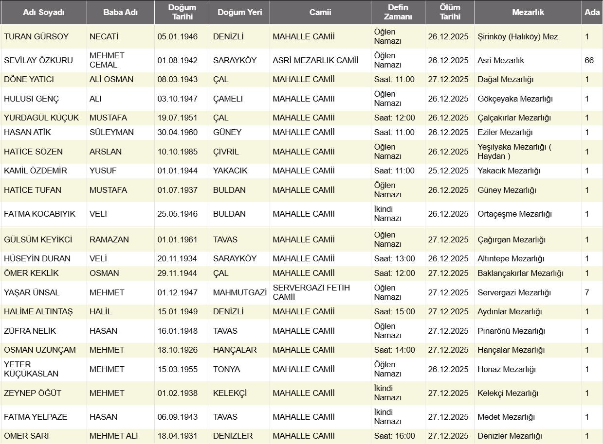 Denizli il sınırları içerisinde vefat edenlerin, cenaze namazlarının kılınacağı cami ve kaldırılacağı mezarlık bilgileri... 27 Aralık 2025 günü Cumartesi Denizli'de vefat edenler.
