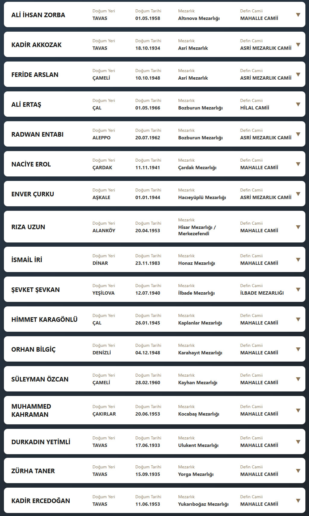 Denizli il sınırları içerisinde vefat edenlerin, cenaze namazlarının kılınacağı cami ve kaldırılacağı mezarlık bilgileri... 27 Nisan 2026 Pazartesi günü Denizli'de vefat edenler.