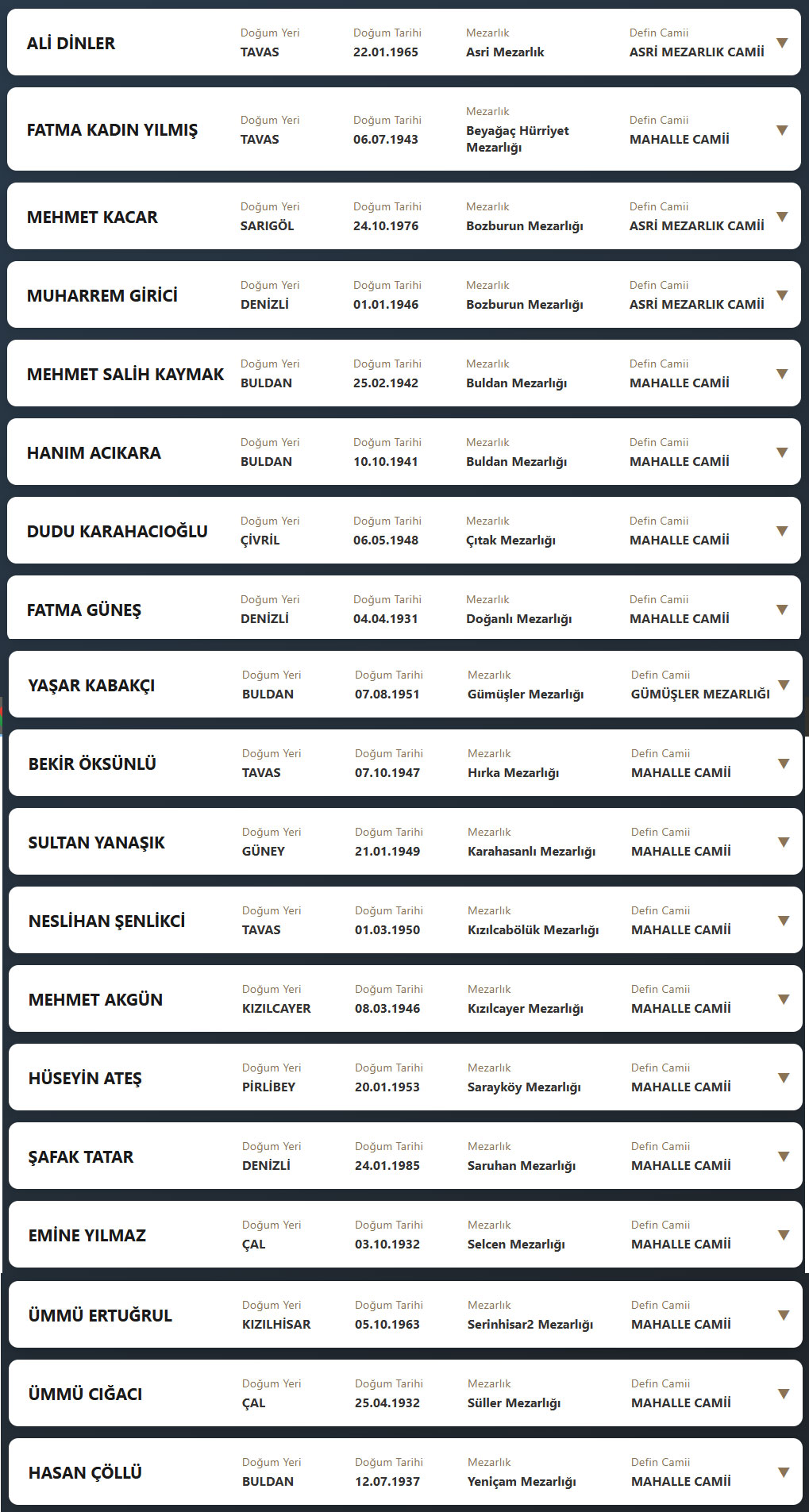 Denizli il sınırları içerisinde vefat edenlerin, cenaze namazlarının kılınacağı cami ve kaldırılacağı mezarlık bilgileri... 28 Şubat 2026 günü Cumartesi Denizli'de vefat edenler.