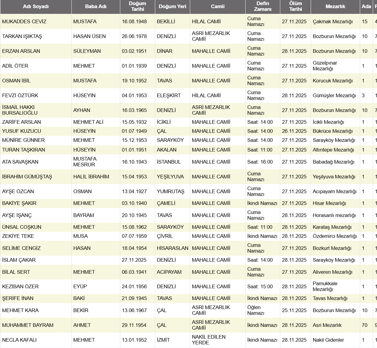 Denizli'de bugün vefat edenler 28 Kasım 2025