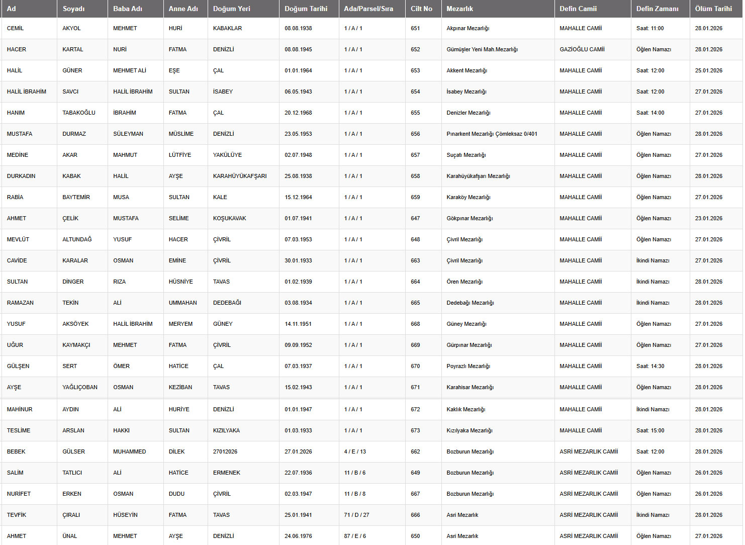 Denizli'de bugün vefat edenler 28 Ocak 2026