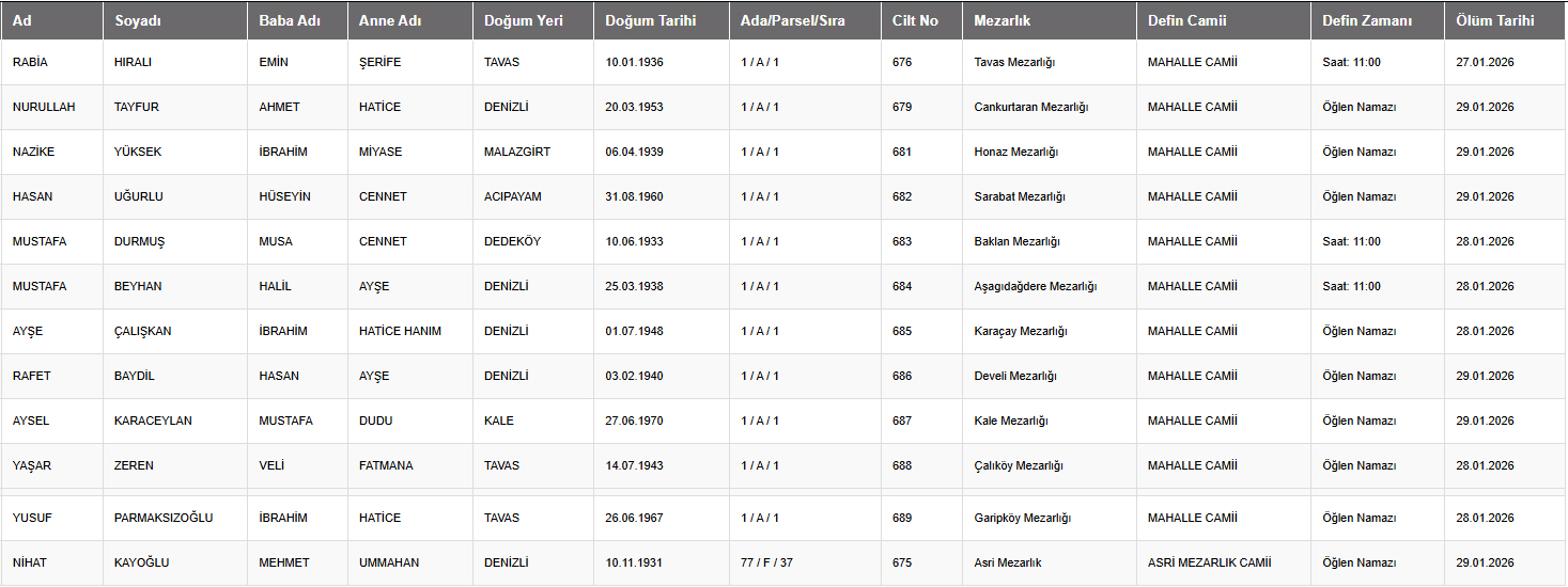 Denizli il sınırları içerisinde vefat edenlerin, cenaze namazlarının kılınacağı cami ve kaldırılacağı mezarlık bilgileri... 29 Ocak 2026 günü Perşembe Denizli'de vefat edenler.