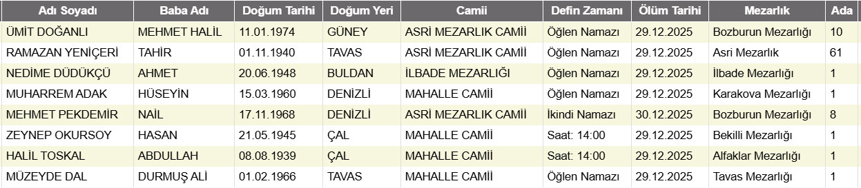 Denizli'de bugün vefat edenler 30 Aralık 2025