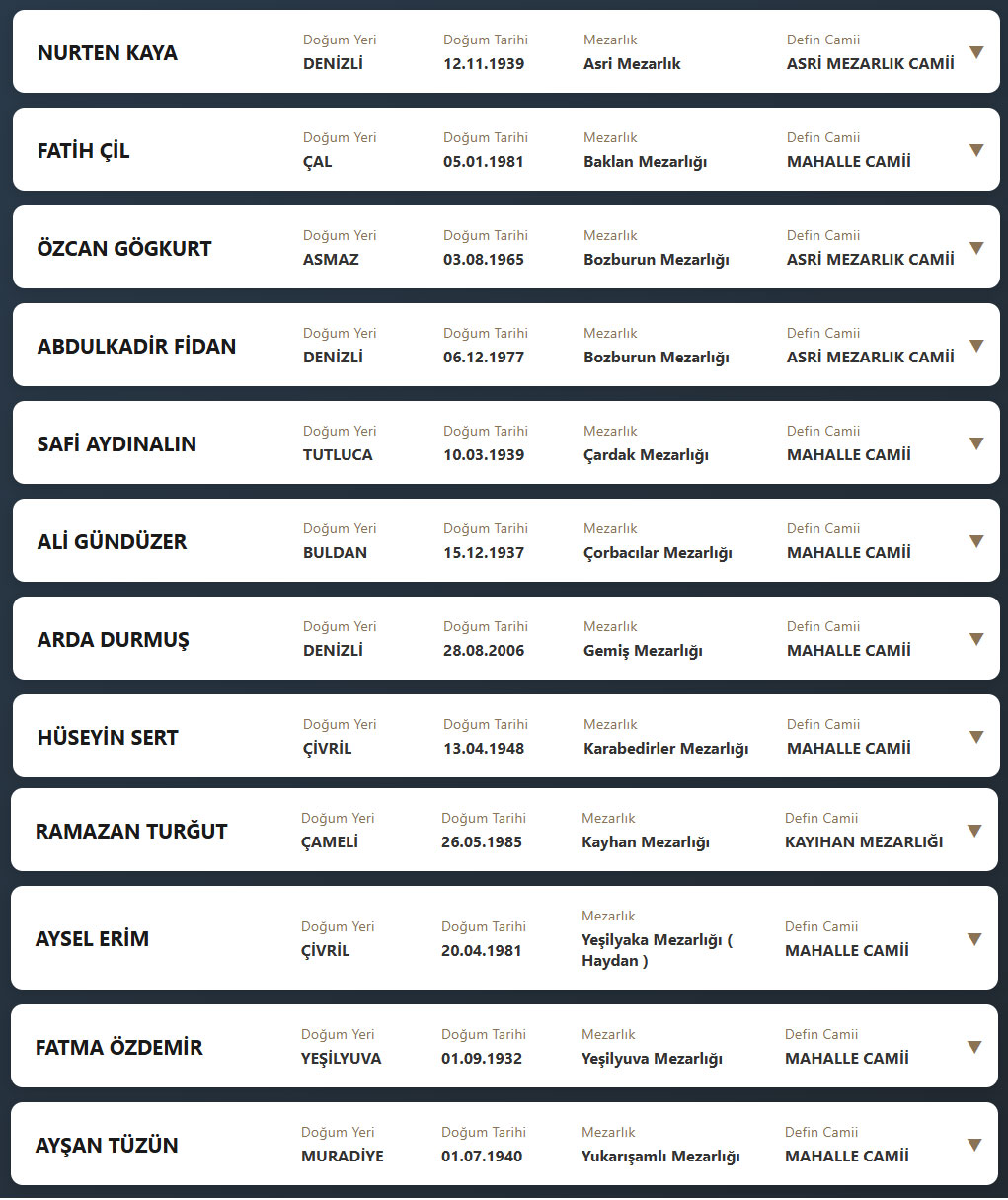 Denizli il sınırları içerisinde vefat edenlerin, cenaze namazlarının kılınacağı cami ve kaldırılacağı mezarlık bilgileri... 30 Nisan 2026 Perşembe günü Denizli'de vefat edenler.
