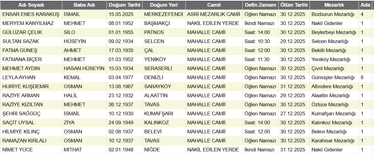 Denizli'de bugün vefat edenler 31 Aralık 2025