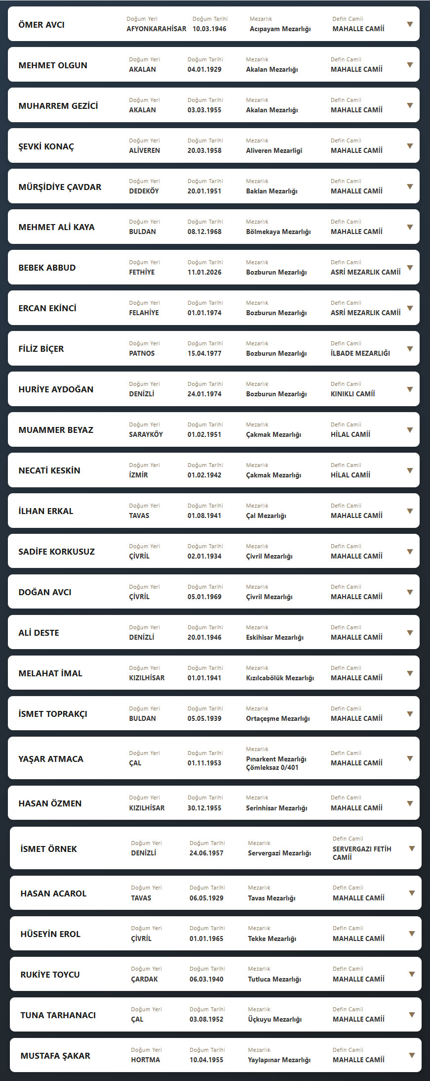 Denizli il sınırları içerisinde vefat edenlerin, cenaze namazlarının kılınacağı cami ve kaldırılacağı mezarlık bilgileri... 4 Şubat 2026 günü Çarşamba Denizli'de vefat edenler.