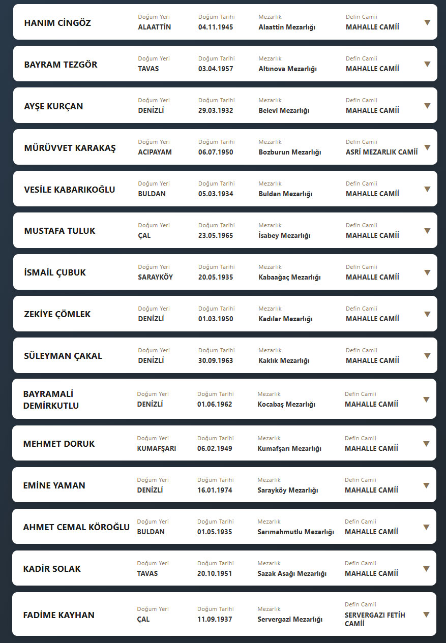 Denizli il sınırları içerisinde vefat edenlerin, cenaze namazlarının kılınacağı cami ve kaldırılacağı mezarlık bilgileri... 6 Şubat 2026 günü Cuma Denizli'de vefat edenler.