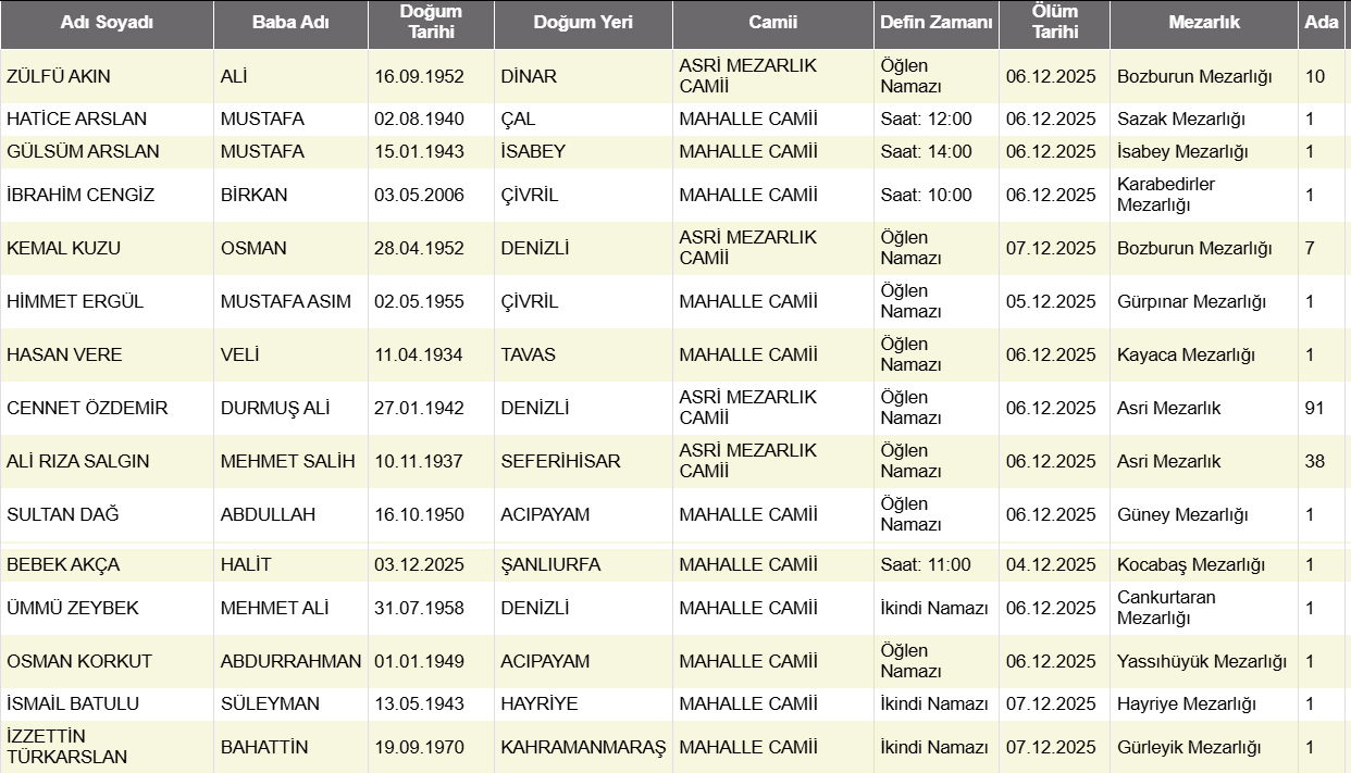 Denizli il sınırları içerisinde vefat edenlerin, cenaze namazlarının kılınacağı cami ve kaldırılacağı mezarlık bilgileri... 7 Aralık 2025 günü Pazar Denizli'de vefat edenler.