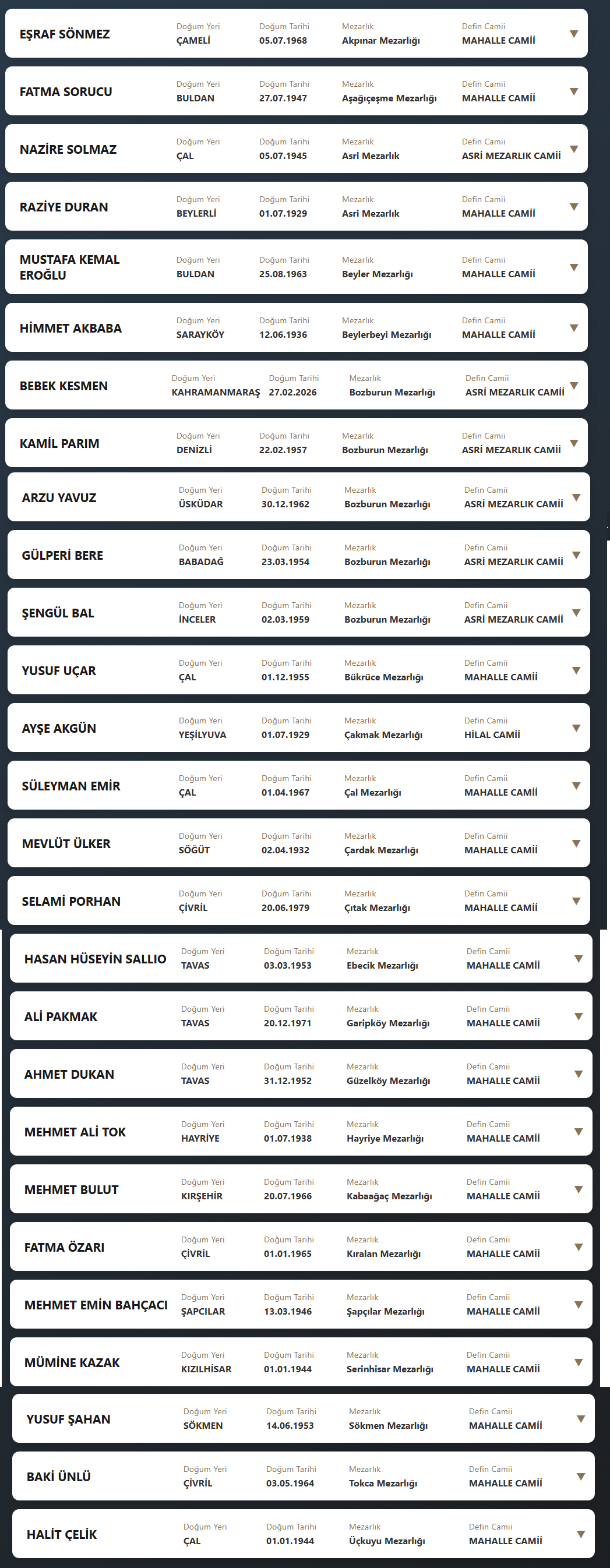 Denizli il sınırları içerisinde vefat edenlerin, cenaze namazlarının kılınacağı cami ve kaldırılacağı mezarlık bilgileri... 07 Mart 2026 Cumartesi günü Denizli'de vefat edenler.